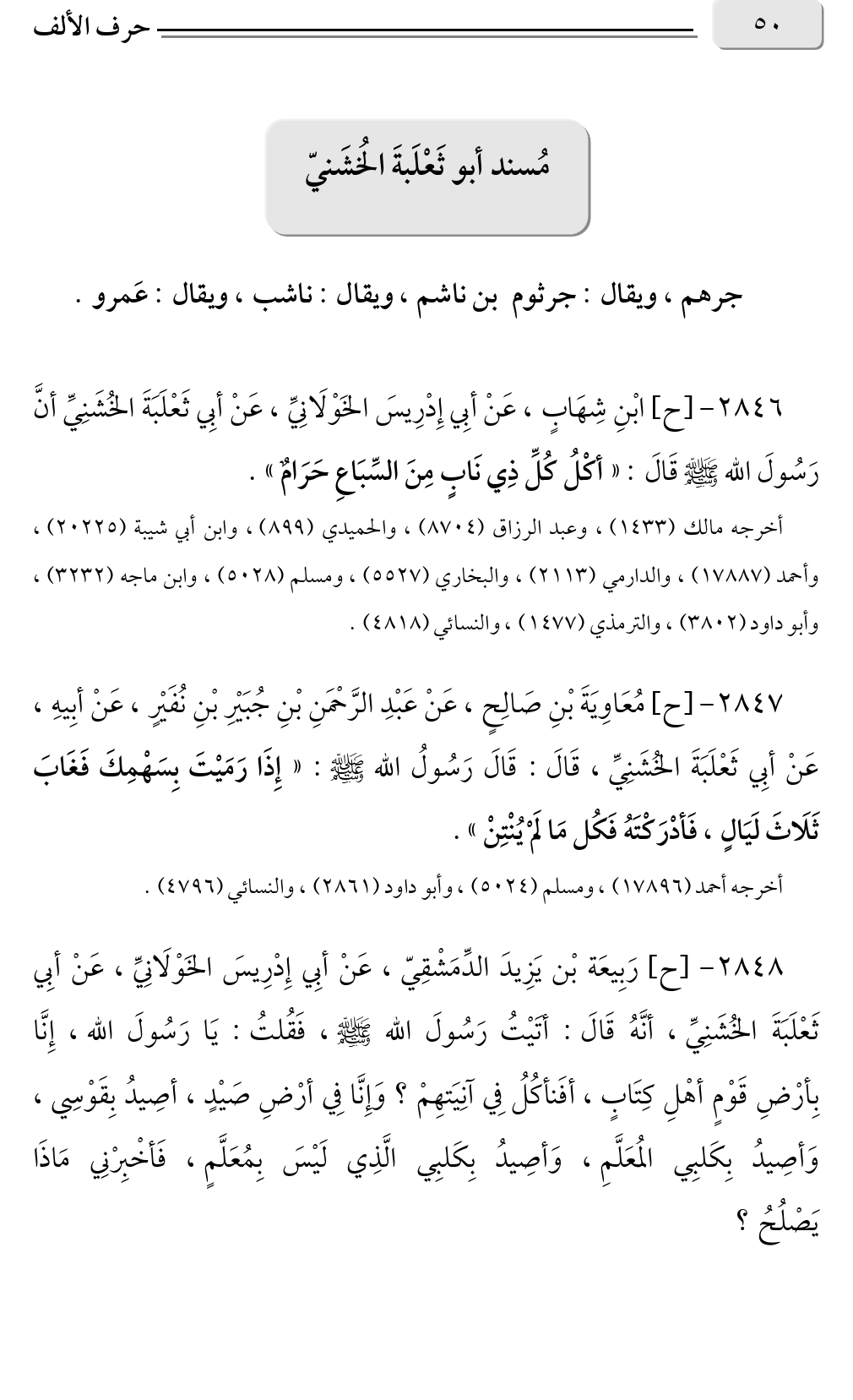 ٢٨٤٦ - [ح] ابْنِ شِهَابٍ، عَنْ أبِي إِدْرِيسَ الخَوْلَانِيِّ، عَنْ أبِي ثَعْلَبَةَ الخُشَنِيِّ أنَّ رَسُولَ الله صلى الله عليه وسلم قَالَ: «أكْلُ كُلِّ ذِي نَابٍ مِنَ السِّبَاعِ حَرَامٌ».