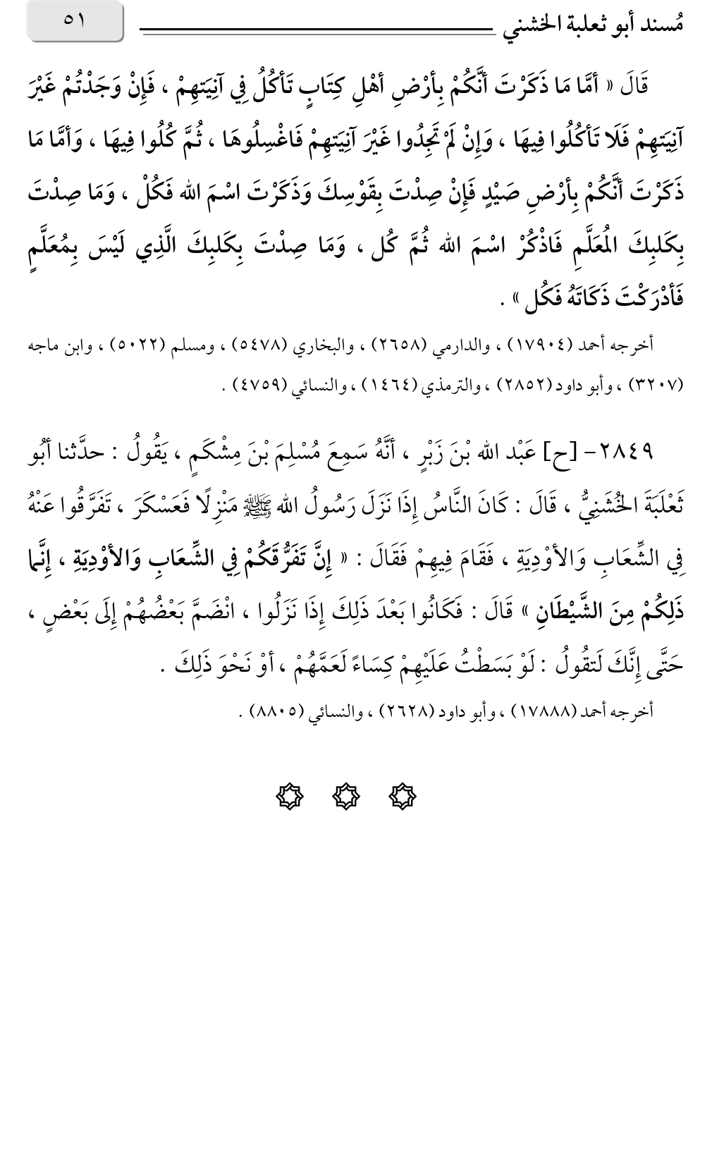 ٢٨٤٩ - [ح] عَبْد الله بْنَ زَبْرٍ، أنَّهُ سَمِعَ مُسْلِمَ بْنَ مِشْكَمٍ، يَقُولُ: حدَّثنا أبُو ثَعْلَبَةَ الخُشَنِيُّ، قَالَ: كَانَ النَّاسُ إِذَا نَزَلَ رَسُولُ الله صلى الله عليه وسلم مَنْزِلًا فَعَسْكَرَ، تَفَرَّقُوا عَنْهُ فِي الشِّعَابِ وَالأوْدِيَةِ، فَقَامَ فِيهِمْ فَقَالَ: «إِنَّ تَفَرُّقَكُمْ فِي الشِّعَابِ وَالأوْدِيَةِ، إِنَّما ذَلِكُمْ مِنَ الشَّيْطَانِ» قَالَ: فَكَانُوا بَعْدَ ذَلِكَ إِذَا نَزَلُوا، انْضَمَّ بَعْضُهُمْ إِلَى بَعْضٍ، حَتَّى إِنَّكَ لَتقُولُ: لَوْ بَسَطْتُ عَلَيْهِمْ كِسَاءً لَعَمَّهُمْ، أوْ نَحْوَ ذَلِكَ.