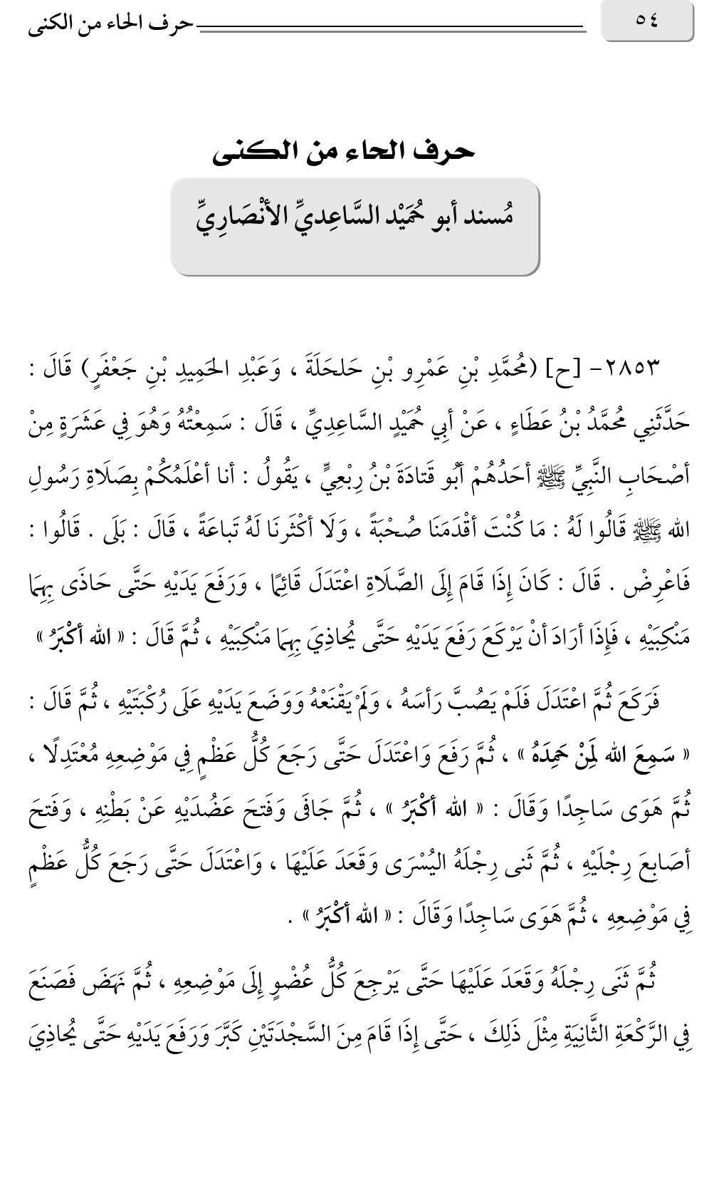٢٨٥٣ - [ح] (مُحمَّدِ بْنِ عَمْرِو بْنِ حَلحَلَةَ، وَعَبْدِ الحَمِيدِ بْنِ جَعْفَرٍ) قَالَ: حَدَّثَنِي مُحمَّدُ بْنُ عَطَاءٍ، عَنْ أبِي حُمَيْدٍ السَّاعِدِيِّ، قَالَ: سَمِعْتُهُ وَهُوَ فِي عَشَرَةٍ مِنْ أصْحَابِ النَّبِيِّ صلى الله عليه وسلم أحَدُهُمْ أبُو قَتادَةَ بْنُ رِبْعِيٍّ، يَقُولُ: أنا أعْلَمُكُمْ بِصَلَاةِ رَسُولِ الله صلى الله عليه وسلم قَالُوا لَهُ: مَا كُنْتَ أقْدَمَنَا صُحْبَةً، وَلَا أكْثَرنَا لَهُ تَباعَةً، قَالَ: بَلَى. قَالُوا: فَاعْرِضْ. قَالَ: كَانَ إِذَا قَامَ إِلَى الصَّلَاةِ اعْتَدَلَ قَائِمًا، وَرَفَعَ يَدَيْهِ حَتَّى حَاذَى بِهِمَا مَنْكِبَيْهِ، فَإِذَا أرَادَ أنْ يَرْكَعَ رَفَعَ يَدَيْهِ حَتَّى يُحاذِيَ بِهِمَا مَنْكِبَيْهِ، ثُمَّ قَالَ: «الله أكْبَرُ».