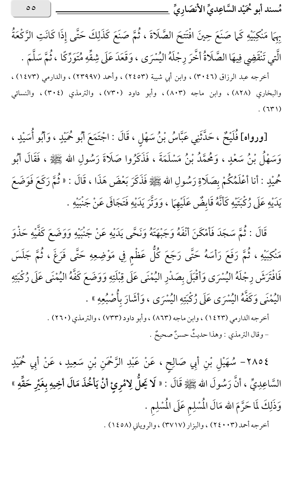 ٢٨٥٤ - سُهَيْلِ بْنِ أبِي صَالِحٍ، عَنْ عَبْدِ الرَّحْمَنِ بْنِ سَعِيدٍ، عَنْ أبِي حُمَيْدٍ السَّاعِدِيِّ، أنَّ رَسُولَ الله صلى الله عليه وسلم قَالَ: «لَا يَحلُّ لِامْرِئٍ أنْ يَأخُذَ مَالَ أخِيهِ بِغَيْرِ حَقِّهِ» وَذَلِكَ لمَا حَرَّمَ الله مَالَ المُسْلِمِ عَلَى المُسْلِمِ.