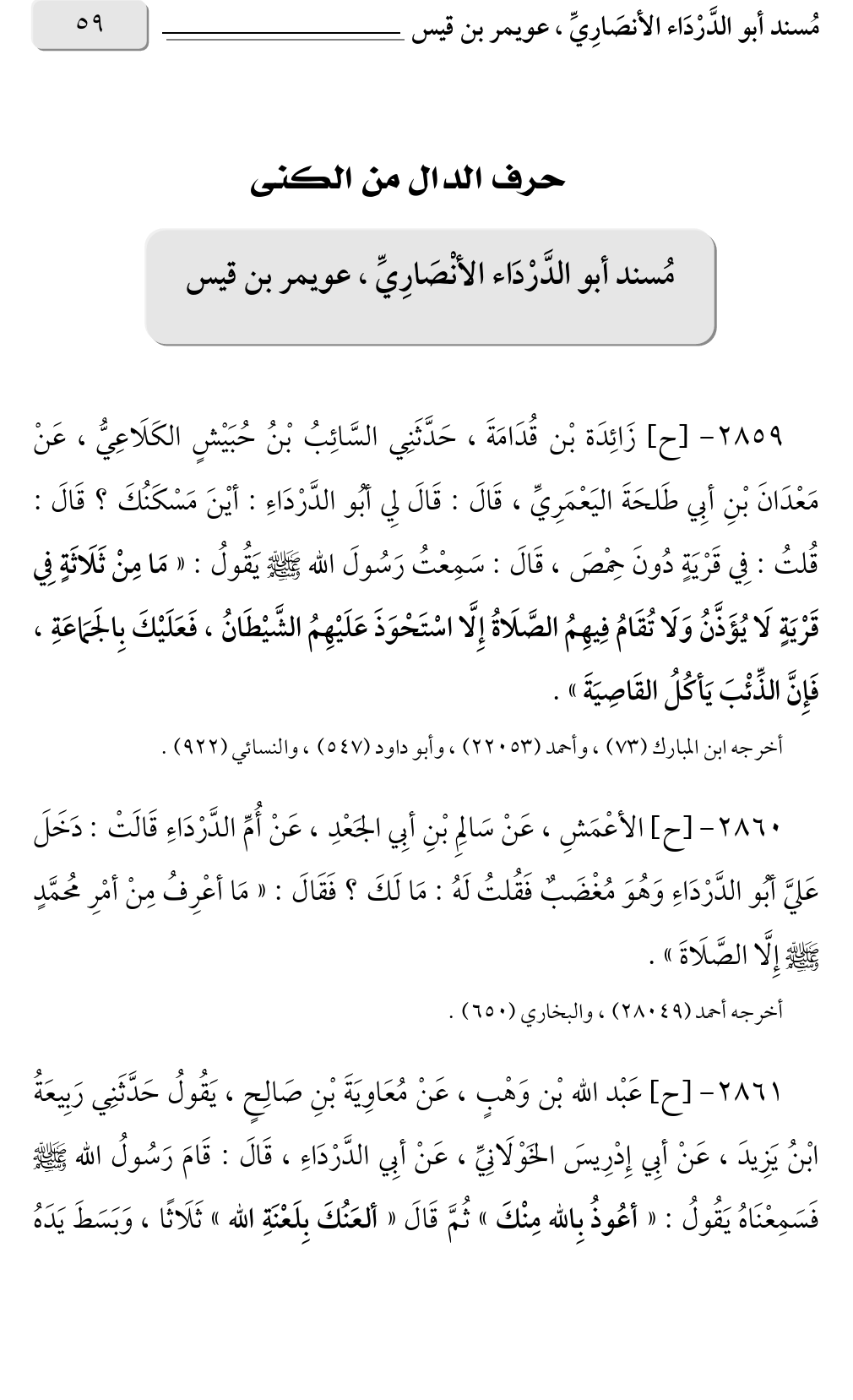٢٨٥٩ - [ح] زَائِدَة بْن قُدَامَةَ، حَدَّثَنِي السَّائِبُ بْنُ حُبَيْشٍ الكَلَاعِيُّ، عَنْ مَعْدَانَ بْنِ أبِي طَلحَةَ اليَعْمَرِيِّ، قَالَ: قَالَ لِي أبُو الدَّرْدَاءِ: أيْنَ مَسْكَنُكَ؟ قَالَ: قُلتُ: فِي قَرْيَةٍ دُونَ حِمْصَ، قَالَ: سَمِعْتُ رَسُولَ الله صلى الله عليه وسلم يَقُولُ: «مَا مِنْ ثَلَاثَةٍ فِي قَرْيَةٍ لَا يُؤَذَّنُ وَلَا تُقَامُ فِيهِمُ الصَّلَاةُ إِلَّا اسْتَحْوَذَ عَلَيْهِمُ الشَّيْطَانُ، فَعَلَيْكَ بِالجَمَاعَةِ، فَإِنَّ الذِّئْبَ يَأكُلُ القَاصِيَةَ».