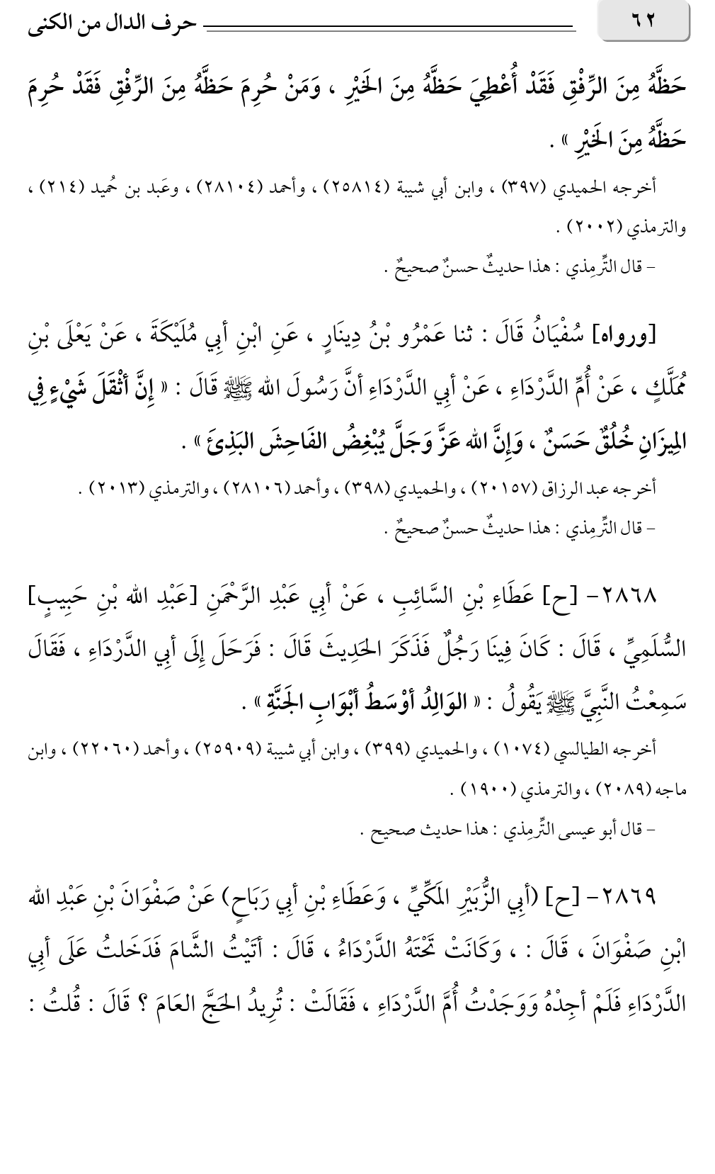 ٢٨٦٨ - [ح] عَطَاءِ بْنِ السَّائِبِ، عَنْ أبِي عَبْدِ الرَّحْمَنِ [عَبْدِ الله بْنِ حَبِيبٍ] السُّلَمِيِّ، قَالَ: كَانَ فِينَا رَجُلٌ فَذَكَرَ الحَدِيثَ قَالَ: فَرَحَلَ إِلَى أبِي الدَّرْدَاءِ، فَقَالَ سَمِعْتُ النَّبِيَّ صلى الله عليه وسلم يَقُولُ: «الوَالِدُ أوْسَطُ أبْوَابِ الجَنَّةِ».