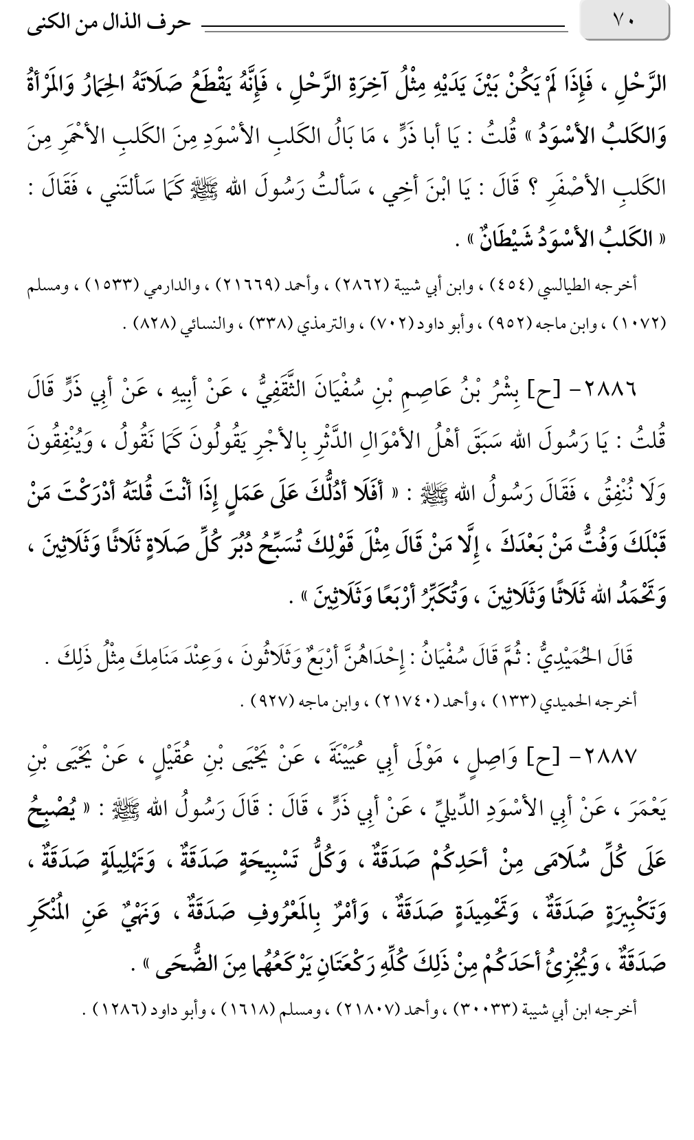٢٨٨٧ - [ح] وَاصِلٍ، مَوْلَى أبِي عُيَيْنَةَ، عَنْ يَحْيَى بْنِ عُقَيْلٍ، عَنْ يَحْيَى بْنِ يَعْمَرَ، عَنْ أبِي الأسْوَدِ الدِّيليِّ، عَنْ أبِي ذَرٍّ، قَالَ: قَالَ رَسُولُ الله صلى الله عليه وسلم: «يُصْبِحُ عَلَى كُلِّ سُلَامَى مِنْ أحَدِكُمْ صَدَقَةٌ، وَكُلُّ تَسْبِيحَةٍ صَدَقَةٌ، وَتَهْلِيلَةٍ صَدَقَةٌ، وَتَكْبِيرَةٍ صَدَقَةٌ، وَتَحْمِيدَةٍ صَدَقَةٌ، وَأمْرٌ بِالمَعْرُوفِ صَدَقَةٌ، وَنَهْيٌ عَنِ المُنْكَرِ صَدَقَةٌ، وَيُجْزِئُ أحَدَكُمْ مِنْ ذَلِكَ كُلِّهِ رَكْعَتَانِ يَرْكَعُهُما مِنَ الضُّحَى».