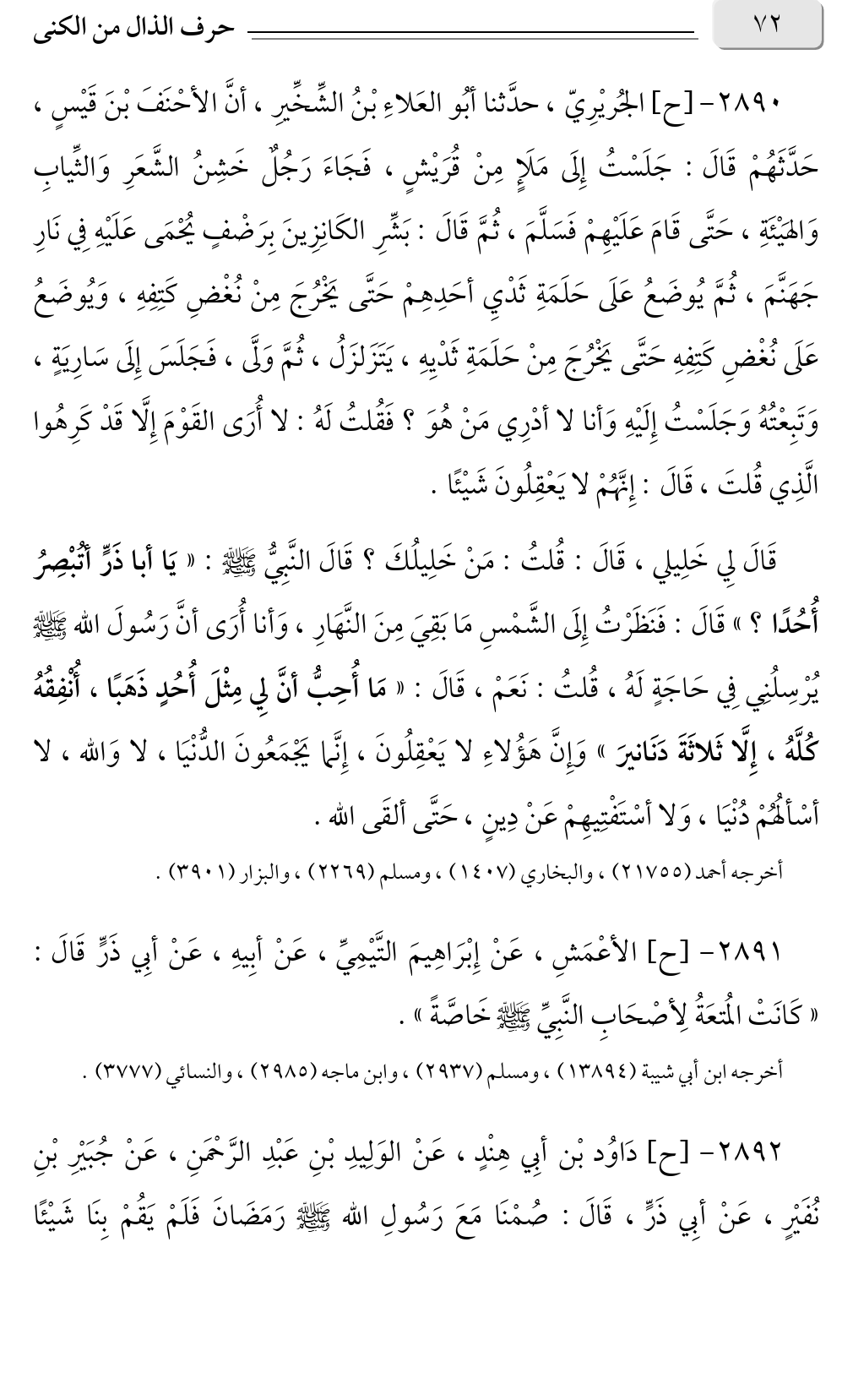 ٢٨٩٠ - [ح] الجُريْرِيّ، حدَّثنا أبُو العَلاءِ بْنُ الشِّخِّيرِ، أنَّ الأحْنَفَ بْنَ قَيْسٍ، حَدَّثَهُمْ قَالَ: جَلَسْتُ إِلَى مَلَإٍ مِنْ قُرَيْشٍ، فَجَاءَ رَجُلٌ خَشِنُ الشَّعَرِ وَالثِّيابِ وَالهَيْئَةِ، حَتَّى قَامَ عَلَيْهِمْ فَسَلَّمَ، ثُمَّ قَالَ: بَشِّرِ الكَانِزِينَ بِرَضْفٍ يُحْمَى عَلَيْهِ فِي نَارِ جَهَنَّمَ، ثُمَّ يُوضَعُ عَلَى حَلَمَةِ ثَدْيِ أحَدِهِمْ حَتَّى يَخْرُجَ مِنْ نُغْضِ كَتِفِهِ، وَيُوضَعُ عَلَى نُغْضِ كَتِفِهِ حَتَّى يَخْرُجَ مِنْ حَلَمَةِ ثَدْيِهِ، يَتَزَلزَلُ، ثُمَّ وَلَّى، فَجَلَسَ إِلَى سَارِيَةٍ، وَتَبِعْتُهُ وَجَلَسْتُ إِلَيْهِ وَأنا لا أدْرِي مَنْ هُوَ؟ فَقُلتُ لَهُ: لا أُرَى القَوْمَ إِلَّا قَدْ كَرِهُوا الَّذِي قُلتَ، قَالَ: إِنَّهُمْ لا يَعْقِلُونَ شَيْئًا.