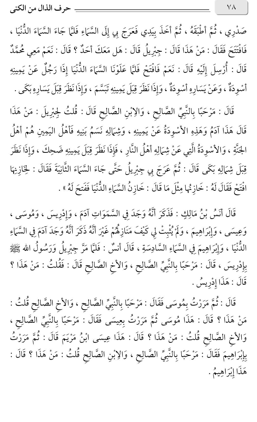 قَالَ: ثُمَّ مَرَرْتُ بِمُوسَى فَقَالَ: مَرْحَبًا بِالنَّبِيِّ الصَّالِحِ، وَالأخِ الصَّالِحِ قُلتُ: مَنْ هَذَا؟ قَالَ: هَذَا مُوسَى ثُمَّ مَرَرْتُ بِعِيسَى فَقَالَ: مَرْحَبًا بِالنَّبِيِّ الصَّالِحِ، وَالأخِ الصَّالِحِ قُلتُ: مَنْ هَذَا؟ قَالَ: هَذَا عِيسَى ابْنُ مَرْيَمَ قَالَ: ثُمَّ مَرَرْتُ بِإِبْرَاهِيمَ فَقَالَ: مَرْحَبًا بِالنَّبِيِّ الصَّالِحِ، وَالِابْنِ الصَّالِحِ قُلتُ: مَنْ هَذَا؟ قَالَ: هَذَا إِبْرَاهِيمُ.