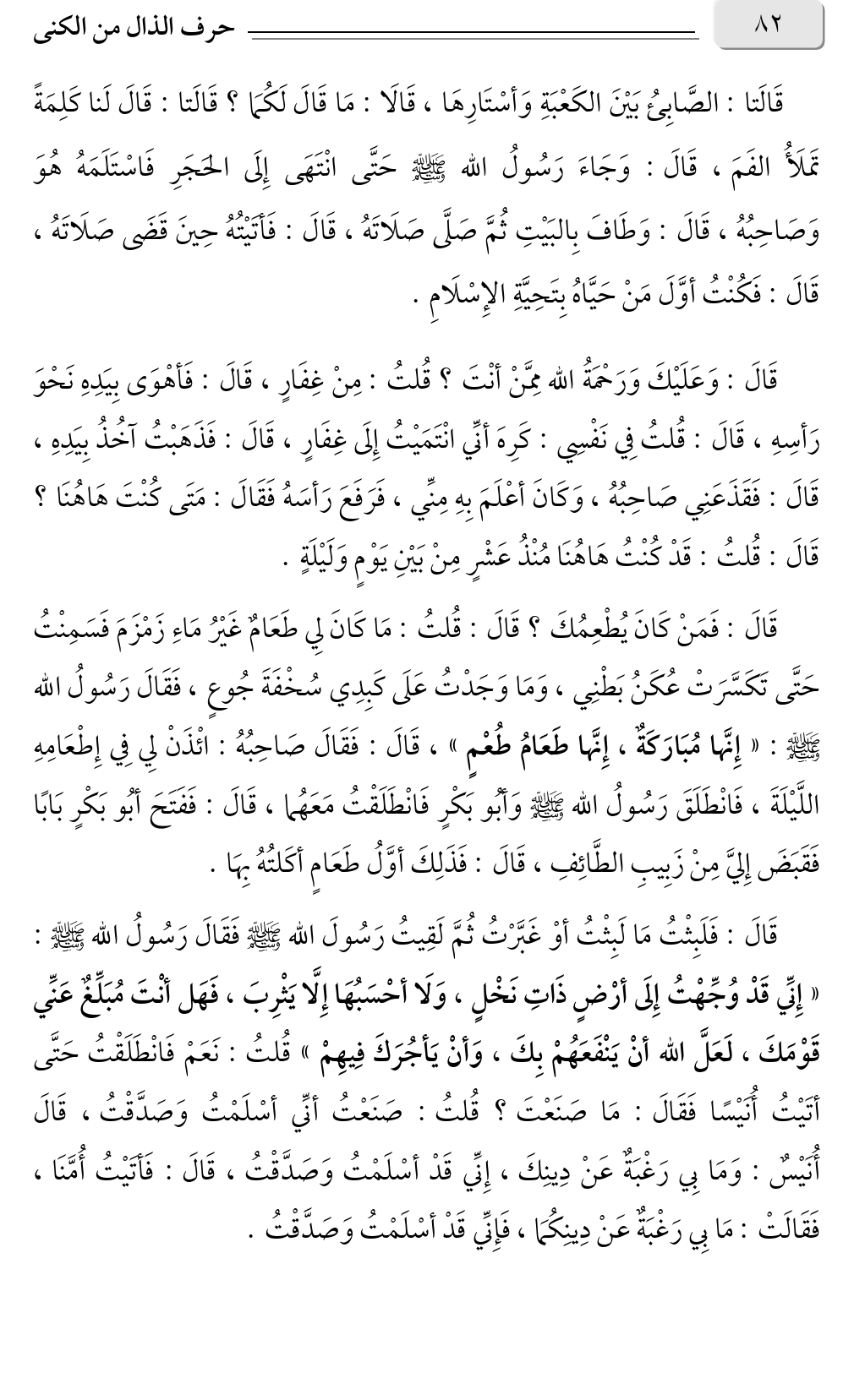 قَالَتا: الصَّابِئُ بَيْنَ الكَعْبَةِ وَأسْتَارِهَا، قَالَا: مَا قَالَ لَكُمَا؟ قَالَتا: قَالَ لَنا كَلِمَةً تَملَأُ الفَمَ، قَالَ: وَجَاءَ رَسُولُ الله صلى الله عليه وسلم حَتَّى انْتَهَى إِلَى الحَجَرِ فَاسْتَلَمَهُ هُوَ وَصَاحِبُهُ، قَالَ: وَطَافَ بِالبَيْتِ ثُمَّ صَلَّى صَلَاتَهُ، قَالَ: فَأتَيْتُهُ حِينَ قَضَى صَلَاتَهُ، قَالَ: فَكُنْتُ أوَّلَ مَنْ حَيَّاهُ بِتَحِيَّةِ الإِسْلَامِ.