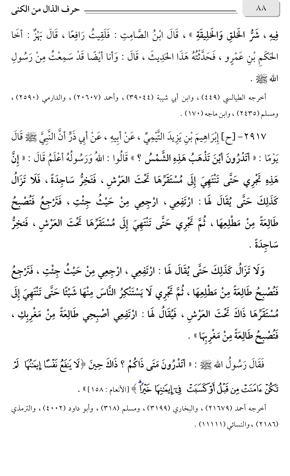 ٢٩١٧ - [ح] إِبْرَاهِيمَ بْنِ يَزِيدَ التَّيْمِيِّ، عَنْ أبِيهِ، عَنْ أبِي ذَرٍّ أنَّ النَّبِيَّ صلى الله عليه وسلم قَالَ يَوْمًا: «أتَدْرُونَ أيْنَ تَذْهَبُ هَذِهِ الشَّمْسُ» قَالُوا: اللهُ وَرَسُولُهُ أعْلَمُ قَالَ: «إِنَّ هَذِهِ تَجْرِي حَتَّى تَنْتَهِيَ إِلَى مُسْتَقَرِّهَا تَحْتَ العَرْشِ، فَتَخِرُّ سَاجِدَةً، فَلَا تَزَالُ كَذَلِكَ حَتَّى يُقَالَ لهَا: ارْتَفِعِي، ارْجِعِي مِنْ حَيْثُ جِئْتِ، فَتَرْجِعُ فَتُصْبِحُ طَالِعَةً مِنْ مَطْلِعِهَا، ثُمَّ تَجْرِي حَتَّى تَنْتَهِيَ إِلَى مُسْتَقَرِّهَا تَحْتَ العَرْشِ، فَتخِرُّ سَاجِدَةً.