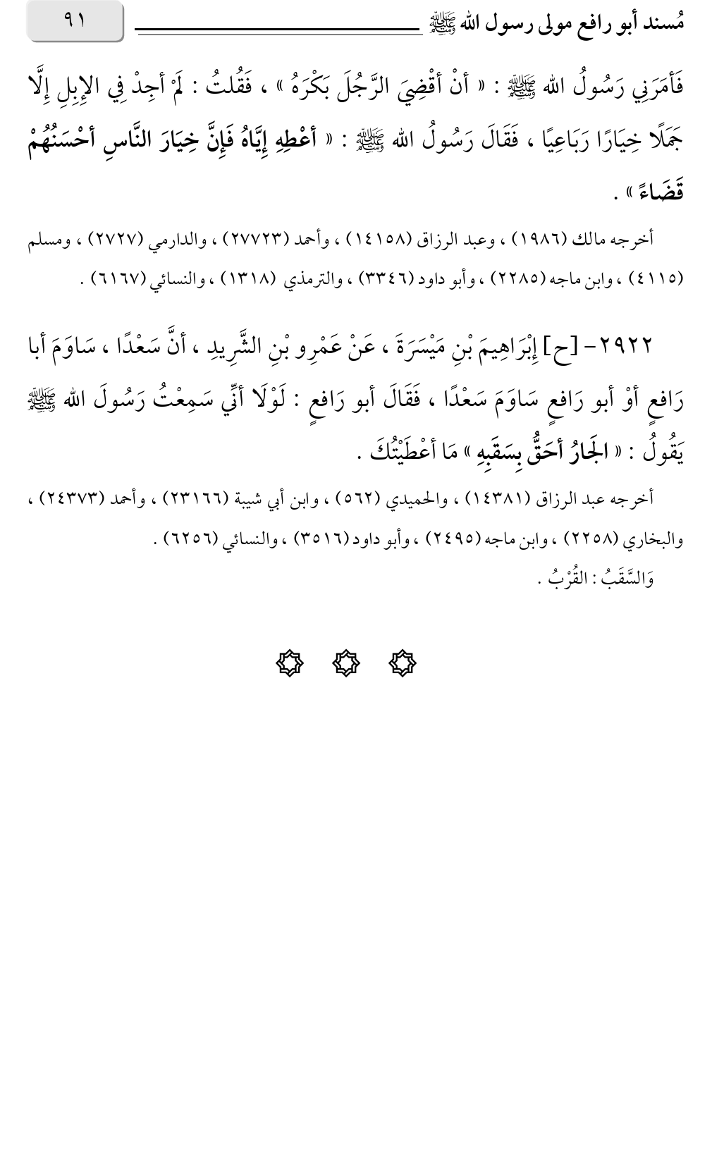 ٢٩٢٢ - [ح] إِبْرَاهِيمَ بْنِ مَيْسَرَةَ، عَنْ عَمْرِو بْنِ الشَّرِيدِ، أنَّ سَعْدًا، سَاوَمَ أبا رَافعٍ أوْ أبو رَافعٍ سَاوَمَ سَعْدًا، فَقَالَ أبو رَافعٍ: لَوْلَا أنِّي سَمِعْتُ رَسُولَ الله صلى الله عليه وسلم يَقُولُ: «الجَارُ أحَقُّ بِسَقَبِهِ» مَا أعْطَيْتُكَ.