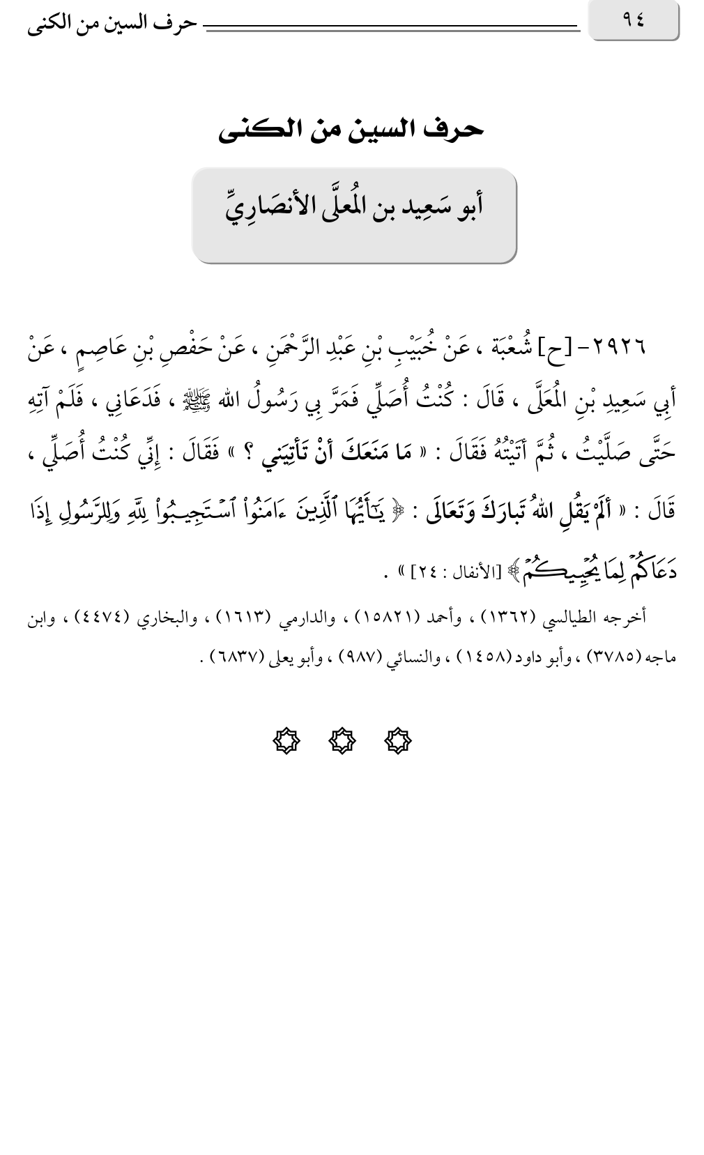 ٢٩٢٦ - [ح] شُعْبَة، عَنْ خُبَيْبِ بْنِ عَبْدِ الرَّحْمَنِ، عَنْ حَفْصِ بْنِ عَاصِمٍ، عَنْ أبِي سَعِيدِ بْنِ المُعَلَّى، قَالَ: كُنْتُ أُصَلِّي فَمَرَّ بِي رَسُولُ الله صلى الله عليه وسلم، فَدَعَانِي، فَلَمْ آتِهِ حَتَّى صَلَّيْتُ، ثُمَّ أتَيْتُهُ فَقَالَ: «مَا مَنَعَكَ أنْ تَأتِيَني؟ » فَقَالَ: إِنِّي كُنْتُ أُصَلِّي، قَالَ: «ألَمْ يَقُلِ اللهُ تَبارَكَ وَتَعَالَى: {يَاأَيُّهَا الَّذِينَ آمَنُوا اسْتَجِيبُوا لِلَّهِ وَلِلرَّسُولِ إِذَا دَعَاكُمْ لِمَا يُحْيِيكُمْ} [الأنفال: ٢٤]».