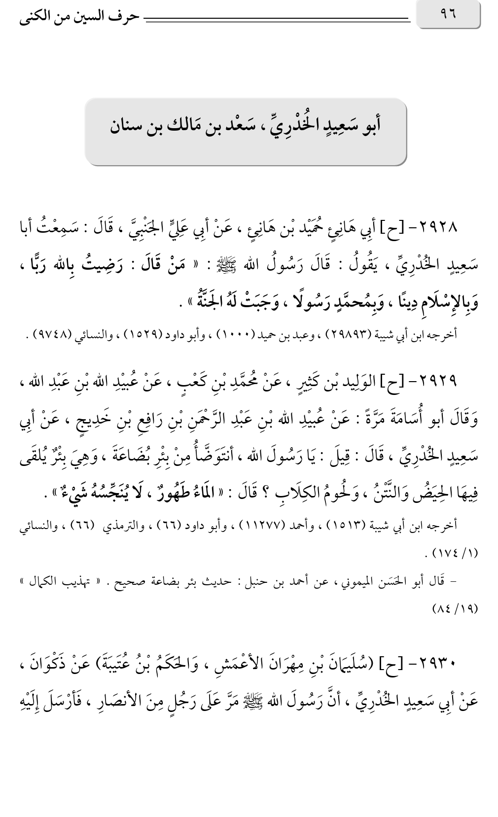 ٢٩٢٩ - [ح] الوَلِيد بْن كَثِيرٍ، عَنْ مُحمَّدِ بْنِ كَعْبٍ، عَنْ عُبيْدِ الله بْنِ عَبْدِ الله، وَقَالَ أبو أُسَامَةَ مَرَّةً: عَنْ عُبيْدِ الله بْنِ عَبْدِ الرَّحْمَنِ بْنِ رَافِعِ بْنِ خَدِيجٍ، عَنْ أبِي سَعِيدٍ الخُدْرِيِّ، قَالَ: قِيلَ: يَا رَسُولَ الله، أنتَوَضَّأُ مِنْ بِئْرِ بُضَاعَةَ، وَهِيَ بِئْرٌ يُلقَى فِيهَا الحِيَضُ وَالنَّتْنُ، وَلحُومُ الكِلَابِ؟ قَالَ: «المَاءُ طَهُورٌ، لَا يُنَجِّسُهُ شَيْءٌ».