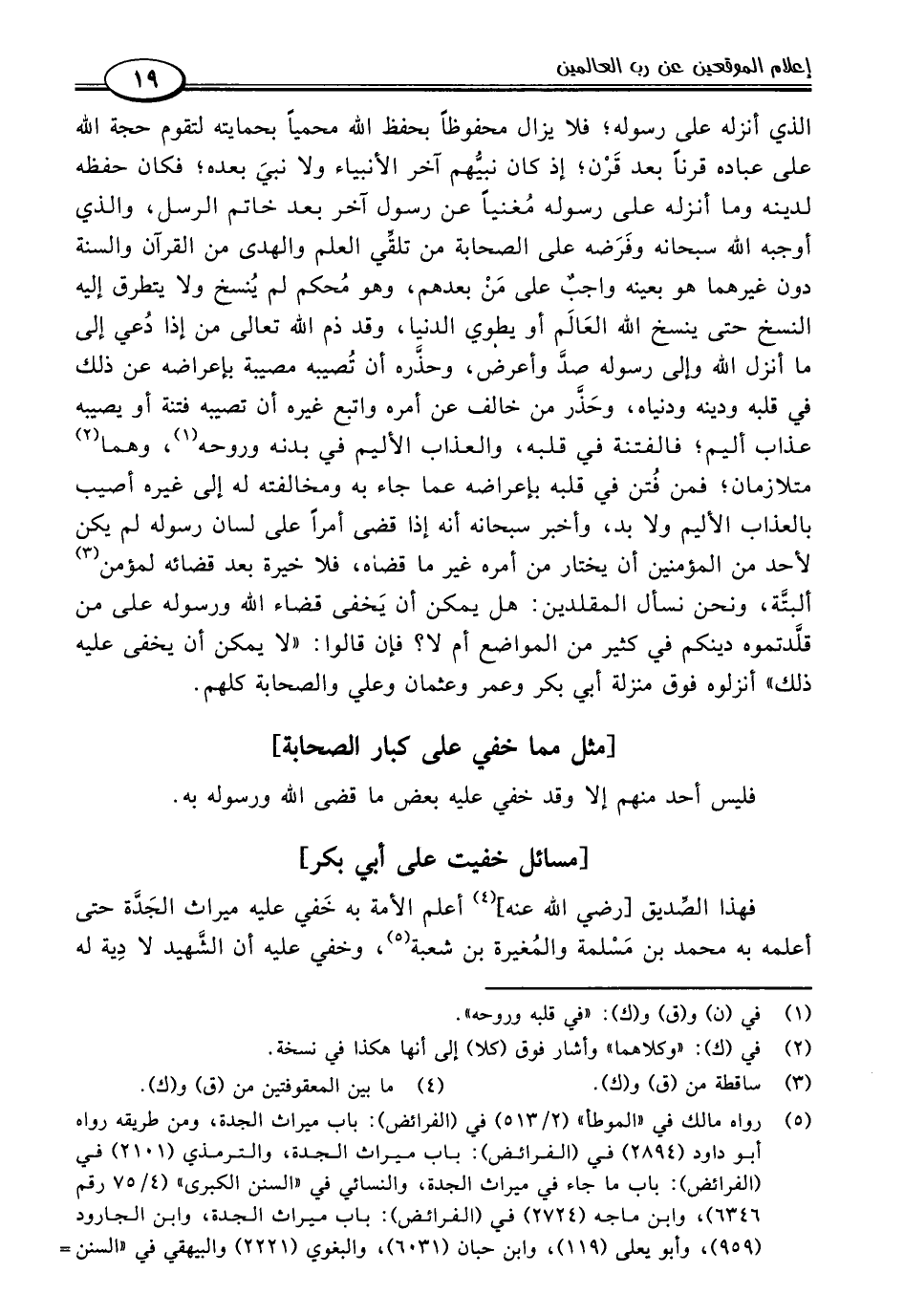 فهذا الصِّديق [رضي اللَّه عنه] (٤) أعلم الأمة به خَفي عليه ميراث الجَدَّة حتى أعلمه به محمد بن مَسْلمة والمُغيرة بن شعبة (٥)، وخفي عليه أن الشَّهيد لا دِية له