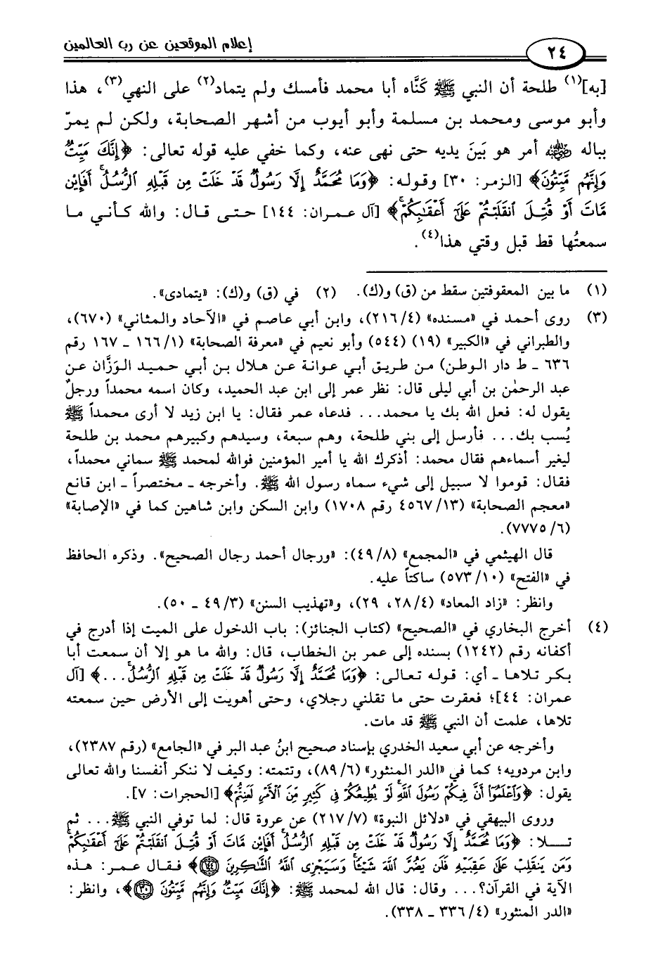 [به] (١) طلحة أن النبي -صلى اللَّه عليه وسلم- كَنَّاه أبا محمد فأمسك ولم يتماد (٢) على النهي (٣)، هذا وأبو موسى ومحمد بن مسلمة وأبو أيوب من أشهر الصحابة، ولكن لم يمرّ بباله -رضي اللَّه عنه- أمر هو بَيْنَ يديه حتى نهى عنه، وكما خفي عليه قوله تعالى: {إِنَّكَ مَيِّتٌ وَإِنَّهُمْ مَيِّتُونَ} [الزمر: ٣٠] وقوله: {وَمَا مُحَمَّدٌ إِلَّا رَسُولٌ قَدْ خَلَتْ مِنْ قَبْلِهِ الرُّسُلُ أَفَإِنْ مَاتَ أَوْ قُتِلَ انْقَلَبْتُمْ عَلَى أَعْقَابِكُمْ} [آل عمران: ١٤٤] حتى قال: واللَّه كأني ما سمعتُها قط قبل وقتي هذا (٤).