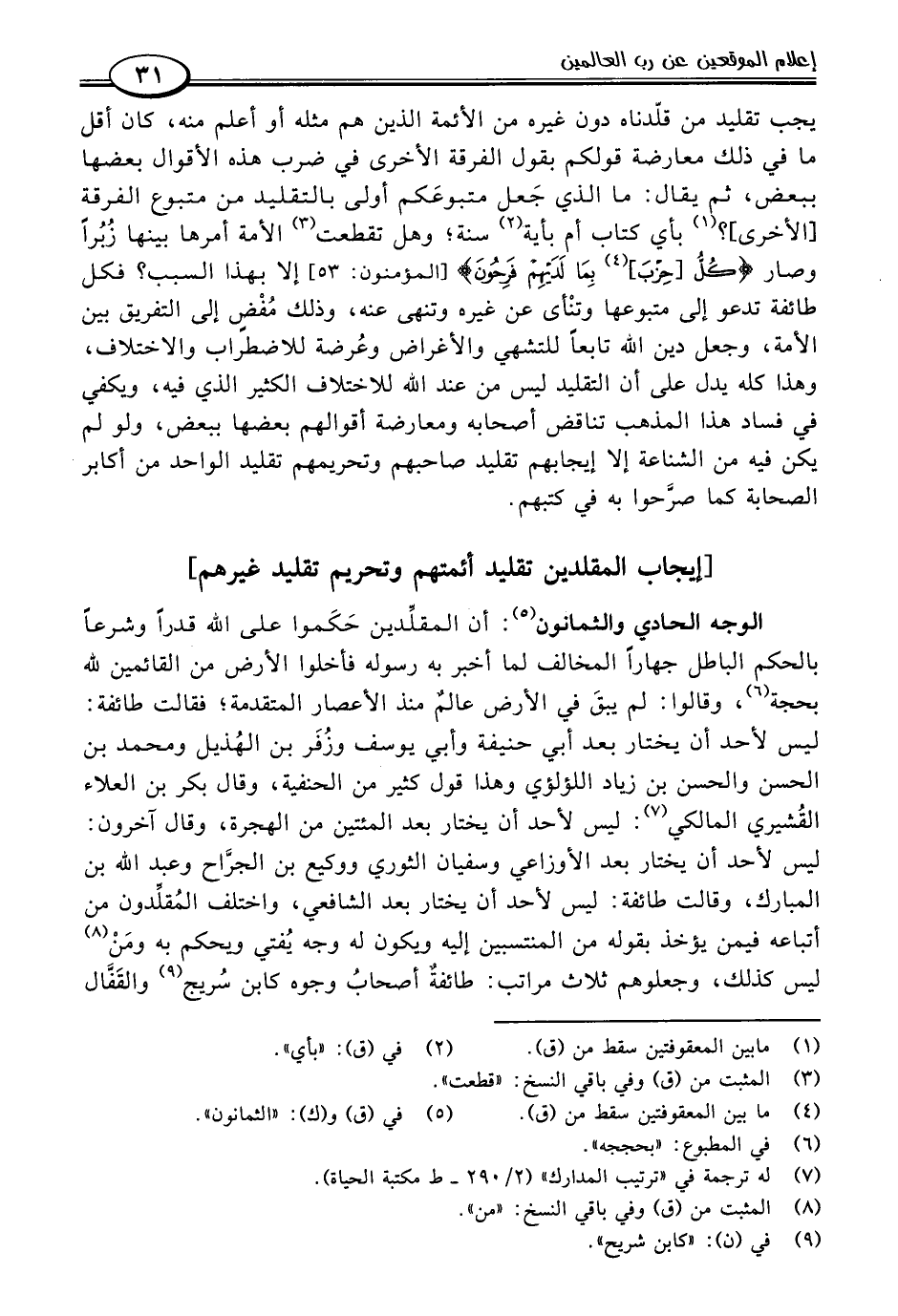 يجب تقليد من قلّدناه دون غيره من الأئمة الذين هم مثله أو أعلم منه، كان أقل ما في ذلك معارضة قولكم بقول الفرقة الأخرى في ضرب هذه الأقوال بعضها ببعض، ثم يقال: ما الذي جَعل متبوعَكم أولى بالتقليد من متبوع الفرقة [الأخرى]؟ (١) بأي كتاب أم بأية (٢) سنة؛ وهل تقطعت (٣) الأمة أمرها بينها زُبُرًا وصار {كُلُّ [حِزْبٍ] (٤) بِمَا لَدَيْهِمْ فَرِحُونَ} [المؤمنون: ٥٣] إلا بهذا السبب؟ فكل طائفة تدعو إلى متبوعها وتنْأى عن غيره وتنهى عنه، وذلك مُفْضٍ إلى التفريق بين الأمة، وجعل دين اللَّه تابعًا للتشهي والأغراض وعُرضة للاضطراب والاختلاف، وهذا كله يدل على أن التقليد ليس من عند اللَّه للاختلاف الكثير الذي فيه، ويكفي في فساد هذا المذهب تناقض أصحابه ومعارضة أقوالهم بعضها ببعض، ولو لم يكن فيه من الشناعة إلا إيجابهم تقليد صاحبهم وتحريمهم تقليد الواحد من أكابر الصحابة كما صرَّحوا به في كتبهم.