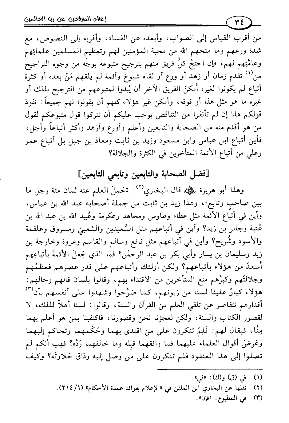 من أقرب القياس إلى الصواب، وأبعده عن الفساد، وأقربه إلى النصوص، مع شدة ورعهم وما منحهم اللَّه من محبة المؤمنين لهم وتعظيمِ المسلمين علمائِهم وعامَّتِهم لهم، فإن احتجَّ كل فريق منهم بترجيح متبوعه بوجه من وجوه التراجيح من (١) تقدم زمان أو زهد أو ورع أو لقاء شيوخ وأئمة لم يلقهم مَنْ بعده أو كثرة أتباع لم يكونوا لغيره أَمكنَ الفريق الآخر أن يُبدوا لمتبوعهم من الترجيح بذلك أو غيره ما هو مثل هذا أو فوقه، وأمكن غير هؤلاء كلهم أن يقولوا لهم جميعًا: نفوذ قولكم هذا إن لم تأنفوا من التناقض يوجب عليكم أن تتركوا قول متبوعكم لقول من هو أقدم منه من الصحابة والتابعين وأعلم وأورع وأزهد وأكثر أتباعًا وأجل، فأين أتباع ابن عباس وابن مسعود وزيد بن ثابت ومعاذ بن جبل بل أتباع عمر وعلي من أتباع الأئمة المتأخرين في الكثرة والجلالة؟
