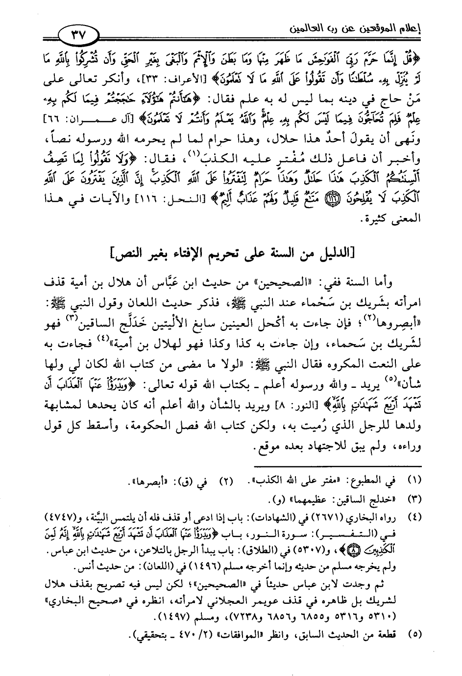 {قُلْ إِنَّمَا حَرَّمَ رَبِّيَ الْفَوَاحِشَ مَا ظَهَرَ مِنْهَا وَمَا بَطَنَ وَالْإِثْمَ وَالْبَغْيَ بِغَيْرِ الْحَقِّ وَأَنْ تُشْرِكُوا بِاللَّهِ مَا لَمْ يُنَزِّلْ بِهِ سُلْطَانًا وَأَنْ تَقُولُوا عَلَى اللَّهِ مَا لَا تَعْلَمُونَ} [الأعراف: ٣٣]، وأنكر تعالى على مَنْ حاج في دينه بما ليس له به علم فقال: {هَاأَنْتُمْ هَؤُلَاءِ حَاجَجْتُمْ فِيمَا لَكُمْ بِهِ عِلْمٌ فَلِمَ تُحَاجُّونَ فِيمَا لَيْسَ لَكُمْ بِهِ عِلْمٌ وَاللَّهُ يَعْلَمُ وَأَنْتُمْ لَا تَعْلَمُونَ} [آل عمران: ٦٦] ونَهى أن يقولَ أحدٌ هذا حلال، وهذا حرام لما لم يحرمه اللَّه ورسوله نصًا، وأخبر أن فاعل ذلك مُفْترٍ عليه الكذبَ (١)، فقال: {وَلَا تَقُولُوا لِمَا تَصِفُ أَلْسِنَتُكُمُ الْكَذِبَ هَذَا حَلَالٌ وَهَذَا حَرَامٌ لِتَفْتَرُوا عَلَى اللَّهِ الْكَذِبَ إِنَّ الَّذِينَ يَفْتَرُونَ عَلَى اللَّهِ الْكَذِبَ لَا يُفْلِحُونَ (١١٦) مَتَاعٌ قَلِيلٌ وَلَهُمْ عَذَابٌ أَلِيمٌ} [النحل: ١١٦] والآيات في هذا المعنى كثيرة.