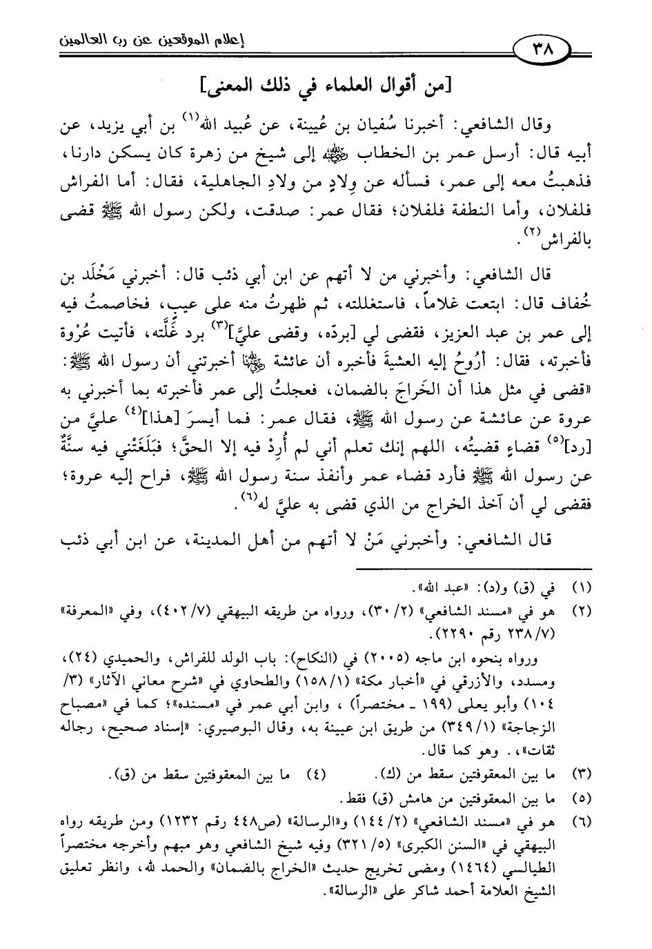 (٦) هو في "مسند الشافعي" (٢/ ١٤٤) و"الرسالة" (ص ٤٤٨ رقم ١٢٣٢) ومن طريقه رواه البيهقي في "السنن الكبرى" (٥/ ٣٢١) وفيه شيخ الشافعي وهو مبهم وأخرجه مختصرًا الطيالسي (١٤٦٤) ومضى تخريج حديث "الخراج بالضمان" والحمد للَّه، وانظر تعليق الشيخ العلامة أحمد شاكر على "الرسالة".
