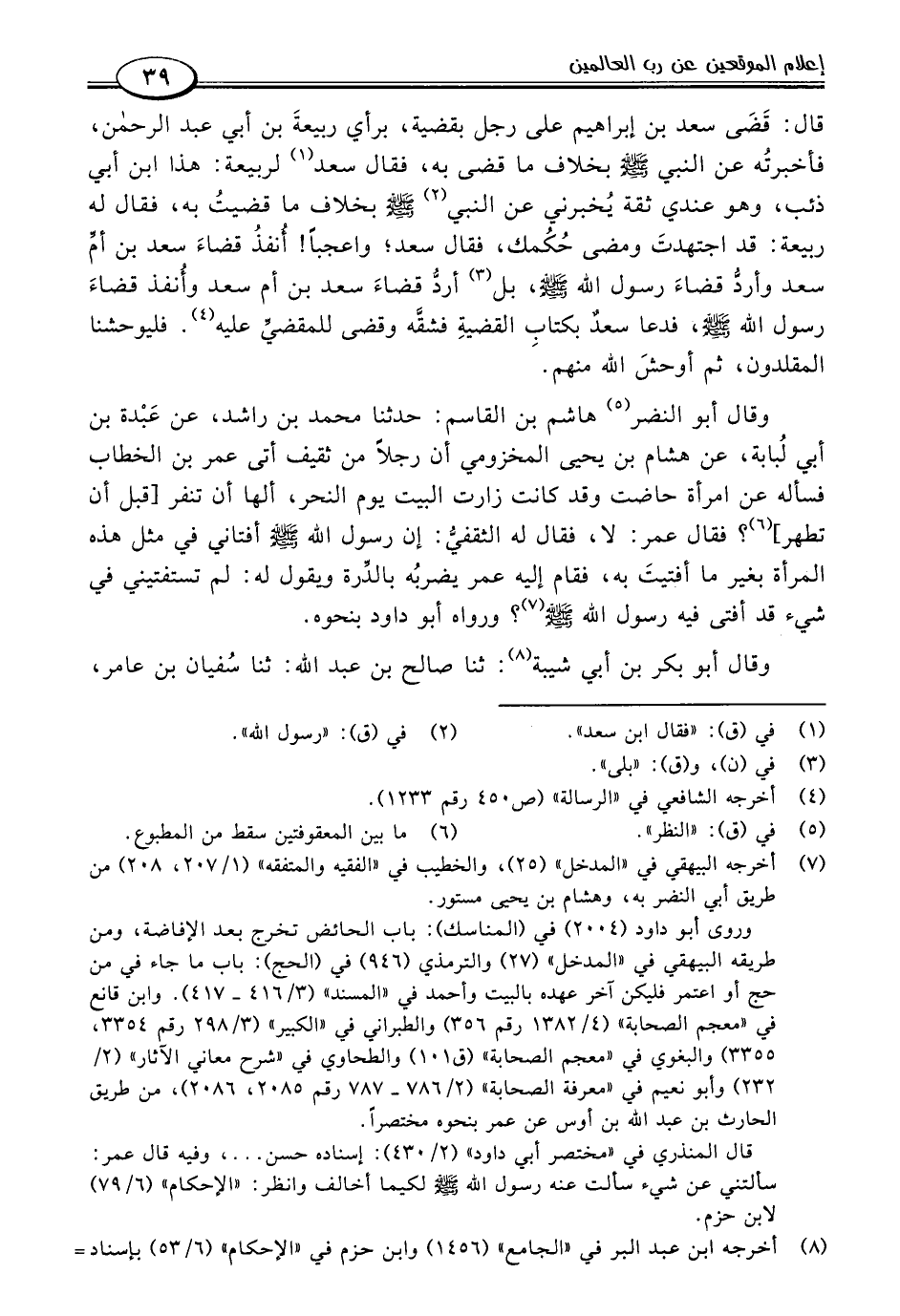 قال: قَضَى سعد بن إبراهيم على رجل بقضية، برأي ربيعةَ بن أبي عبد الرحمن، فأخبرتُه عن النبي -صلى اللَّه عليه وسلم- بخلاف ما قضى به، فقال سعد (١) لربيعة: هذا ابن أبي ذئب، وهو عندي ثقة يُخبرني عن النبي (٢) -صلى اللَّه عليه وسلم- بخلاف ما قضيتُ به، فقال له ربيعة: قد اجتهدتَ ومضى حُكُمك، فقال سعد؛ واعجبًا! أُنفذُ قضاءَ سعد بن أمِّ سعد وأردُّ قضاءَ رسول اللَّه -صلى اللَّه عليه وسلم-، بل (٣) أردُّ قضاءَ سعد بن أم سعد وأُنفذ قضاءَ رسول اللَّه -صلى اللَّه عليه وسلم-، فدعا سعدٌ بكتابِ القضيةِ فشقَّه وقضى للمقضيِّ عليه (٤). فليوحشنا المقلدون، ثم أوحشَ اللَّه منهم.