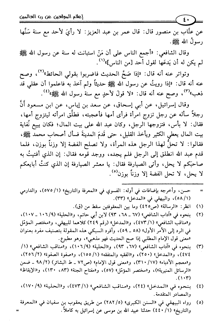 عن عتَّاب بن منصور قال: قال عمر بن عبد العزيز: لا رأيَ لأحد مع سنة سَنَّها رسولُ اللَّه -صلى اللَّه عليه وسلم-.