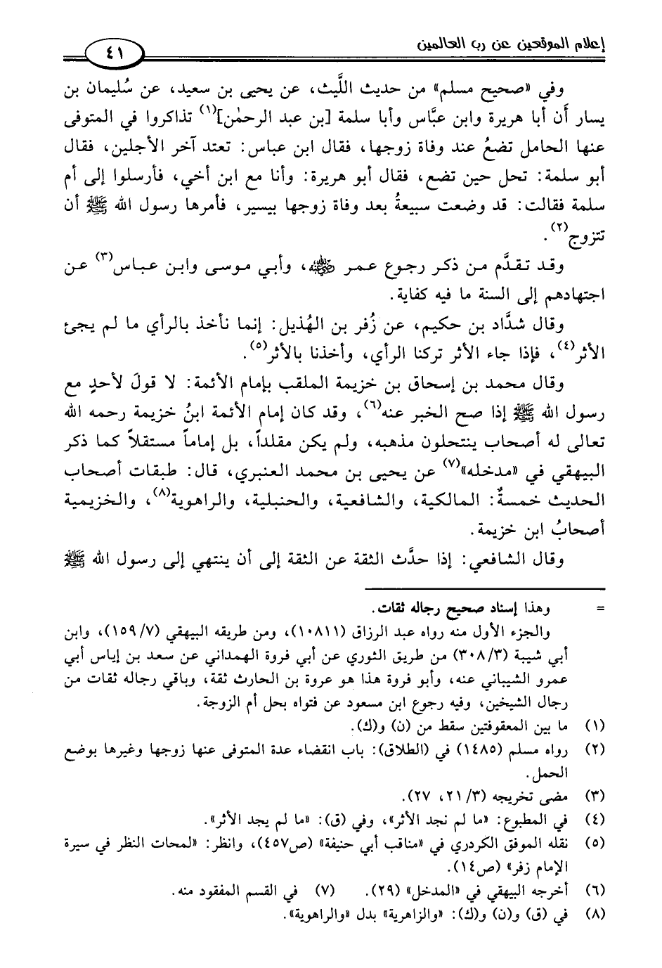 وقال محمد بن إسحاق بن خزيمة الملقب بإمام الأئمة: لا قولَ لأحدٍ مع رسول اللَّه -صلى اللَّه عليه وسلم- إذا صح الخبر عنه (٦)، وقد كان إمام الأئمة ابنُ خزيمة رحمه اللَّه تعالى له أصحاب ينتحلون مذهبه، ولم يكن مقلدًا، بل إمامًا مستقلًا كما ذكر البيهقي في "مدخله" (٧) عن يحيى بن محمد العنبري، قال: طبقات أصحاب الحديث خمسةٌ: المالكية، والشافعية، والحنبلية، والراهوية (٨)، والخزيمية أصحابُ ابن خزيمة.