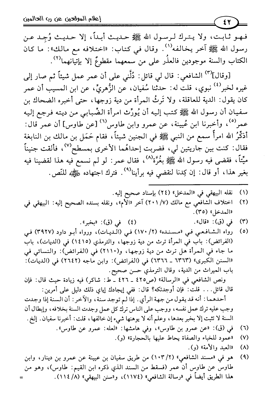 (٩) هو في "مسند الشافعي" (٢/ ١٠٣) من طريق سفيان بن عيينة عن عمرو بن دينار، وابن طاوس عن طاوس أن عمر (فسقط من السند الذي ذكره ابن القيم: طاوس)، وهو من هذا الطريق أيضًا في "رسالة الشافعي" (١١٧٤)، و"سنن البيهقي" (٨/ ١١٤). =