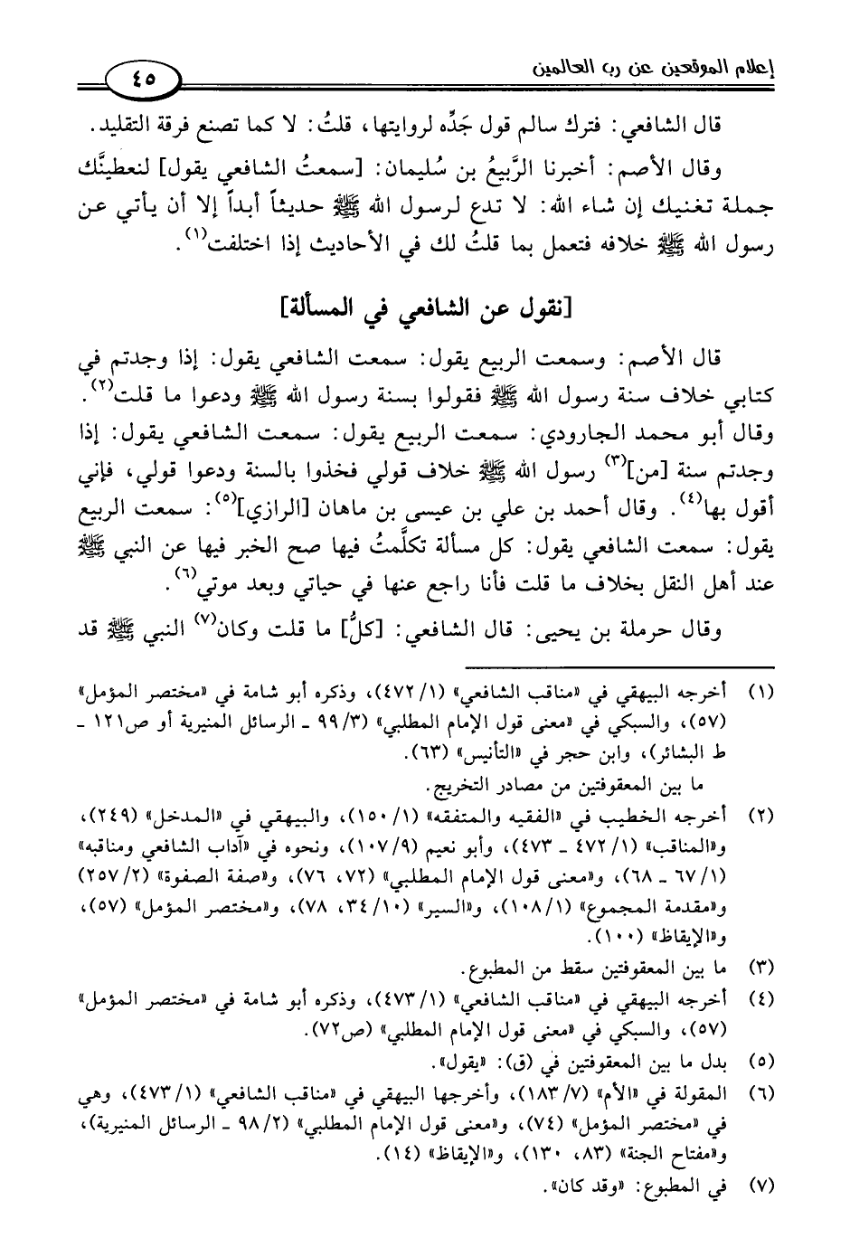 (٦) المقولة في "الأم" (٧/ ١٨٣)، وأخرجها البيهقي في "مناقب الشافعي" (١/ ٤٧٣)، وهي في "مختصر المؤمل" (٧٤)، و"معنى قول الإمام المطلبي" (٢/ ٩٨ - الرسائل المنيرية)، و"مفتاح الجنة" (٨٣، ١٣٠)، و"الإيقاظ" (١٤).