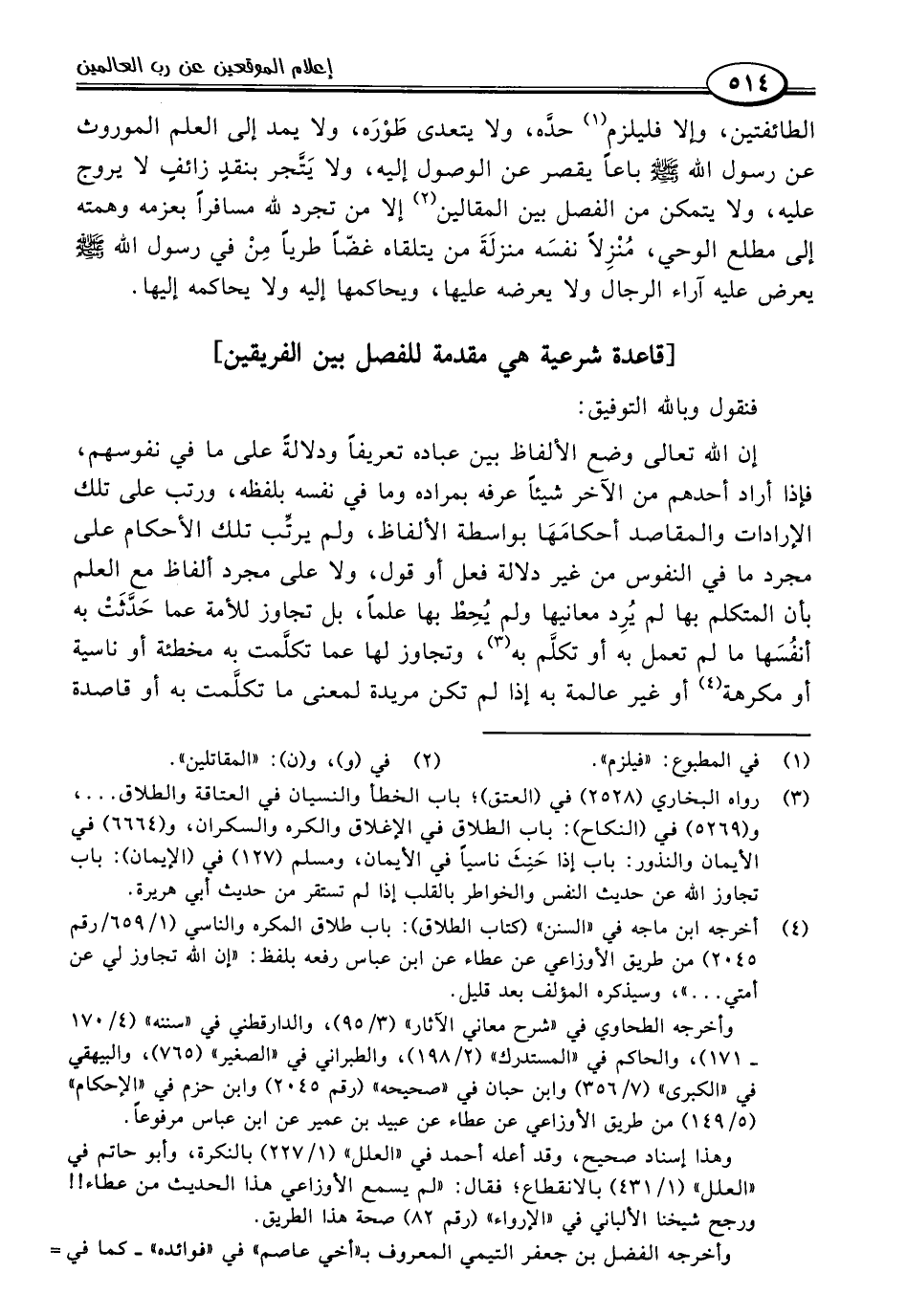إن اللَّه تعالى وضع الألفاظ بين عباده تعريفًا ودلالةً على ما في نفوسهم، فإذا أراد أحدهم من الآخر شيئًا عرفه بمراده وما في نفسه بلفظه، ورتب على تلك الإرادات والمقاصد أحكامَهَا بواسطة الألفاظ، ولم يرتِّب تلك الأحكام على مجرد ما في النفوس من غير دلالة فعل أو قول، ولا على مجرد ألفاظ مع العلم بأن المتكلم بها لم يُرِد معانيها ولم يُحِطْ بها علمًا، بل تجاوز للأمة عما حَدَّثَتْ به أنفُسَها ما لم تعمل به أو تكلَّم به (٣)، وتجاوز لها عما تكلَّمت به مخطئة أو ناسية أو مكرهة (٤) أو غير عالمة به إذا لم تكن مريدة لمعنى ما تكلَّمت به أو قاصدة