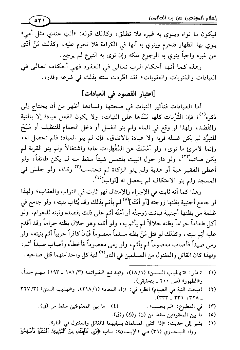 وهذا كما أنه ثابت في الإجزاء والإمتثال فهو ثابت في الثواب والعقاب؛ ولهذا لو جامع أجنبية يظنها زوجته [أو أمَتُه] (٥) لم يأثم بذلك وقد يُثاب بنيته، ولو جامع في ظلمة من يظنها أجنبية فبانت زوجتُه أو أمَتُه أثم على ذلك بقصده ونيته للحرام، ولو أكل طعامًا حرامًا يظنه حلالًا لم يأثم به، ولو أكله وهو حلال يظنه حرامًا وقد أقدم عليه أثِم بنيته، وكذلك لو قتل مَنْ يظنه مسلمًا معصومًا فَبَانَ كافرًا حربيًا أثم بنيته، ولو رمى صيدًا فأصاب معصومًا لم يأثم، ولو رمى معصومًا فأخطأه وأصاب صيدًا أثم، ولهذا كان القاتل والمقتول من المسلمين في النار (٦) لنية كل واحد منهما قتل صاحبه.