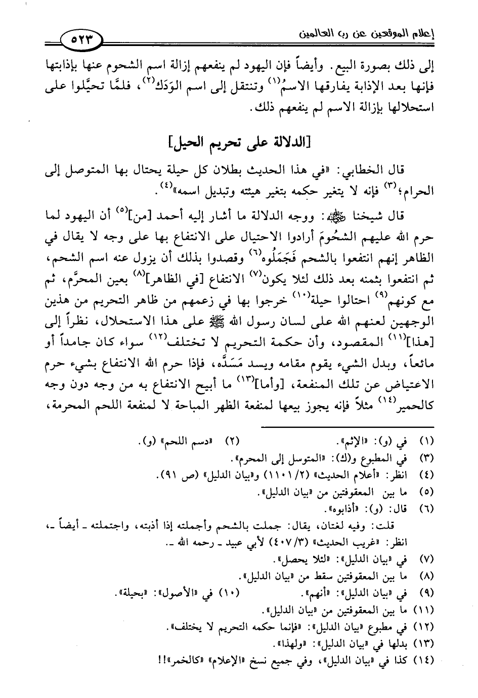 قال شيخنا -رضي اللَّه عنه-: ووجه الدلالة ما أشار إليه أحمد [من] (٥) أن اليهود لما حرم اللَّه عليهم الشحُومَ أرادوا الاحتيال على الانتفاع بها على وجه لا يقال في الظاهر إنهم انتفعوا بالشحم فَجَمَلُوه (٦) وقصدوا بذلك أن يزول عنه اسم الشحم، ثم انتفعوا بثمنه بعد ذلك لئلا يكون (٧) الانتفاع [في الظاهر] (٨) بعين المحرَّم، ثم مع كونهم (٩) احتالوا حيلة (١٠) خرجوا بها في زعمهم من ظاهر التحريم من هذين الوجهين لعنهم اللَّه على لسان رسول اللَّه -صلى اللَّه عليه وسلم- على هذا الاستحلال، نظرًا إلى [هذا] (١١) المقصود، وأن حكمة التحريم لا تختلف (١٢) سواء كان جامدًا أو مائعًا، وبدل الشيء يقوم مقامه ويسد مَسَدَّه، فإذا حرم اللَّه الانتفاع بشيء حرم الاعتياض عن تلك المنفعة، [وأما] (١٣) ما أبيح الانتفاع به من وجه دون وجه كالحمير (١٤) مثلًا فإنه يجوز بيعها لمنفعة الظهر المباحة لا لمنفعة اللحم المحرمة،