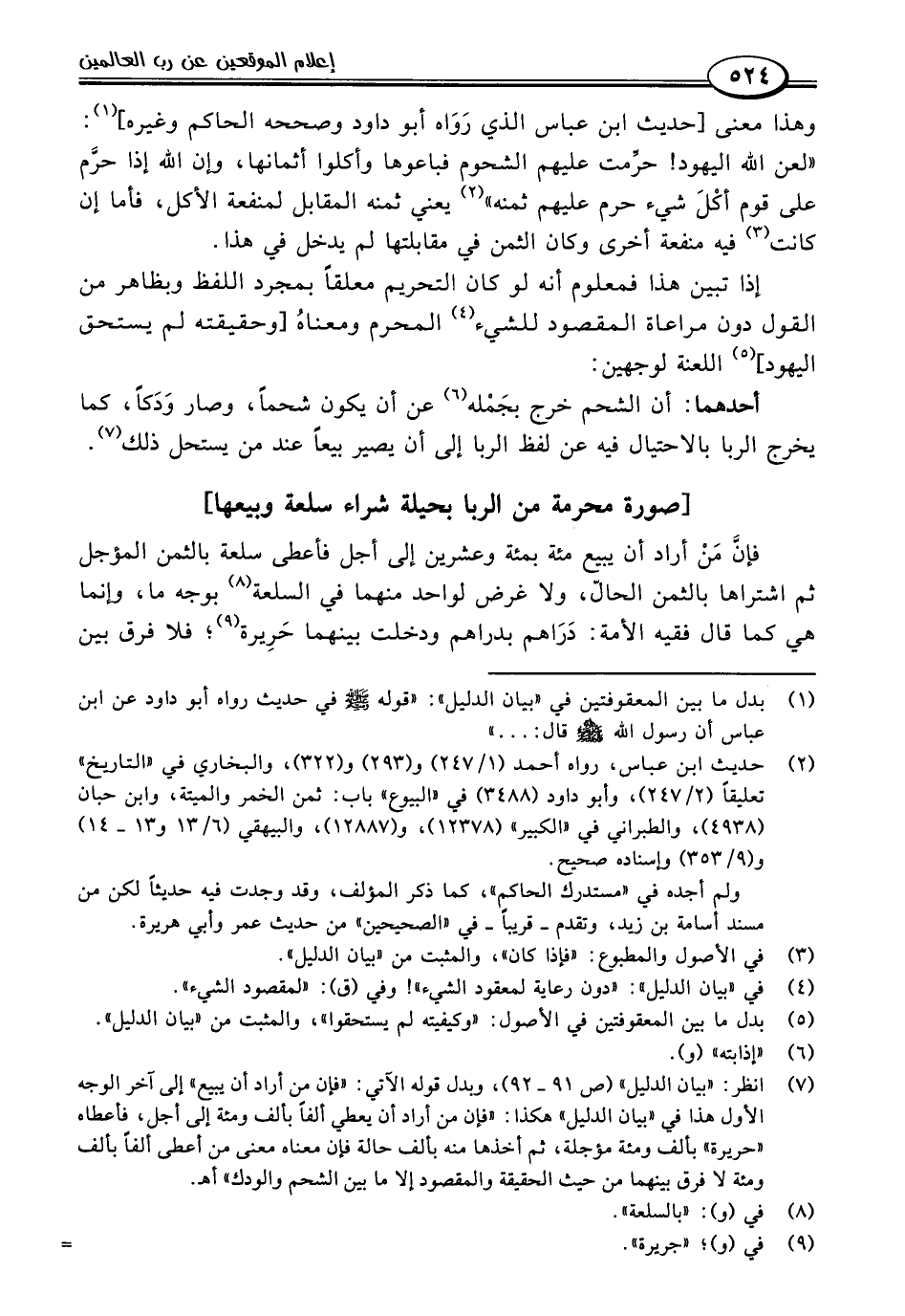 وهذا معنى [حديث ابن عباس الذي رَوَاه أبو داود وصححه الحاكم وغيره] (١): "لعن اللَّه اليهود! حرِّمت عليهم الشحوم فباعوها وأكلوا أثمانها، وإن اللَّه إذا حرَّم على قوم أكْلَ شيء حرم عليهم ثمنه" (٢) يعني ثمنه المقابل لمنفعة الأكل، فأما إن كانت (٣) فيه منفعة أخرى وكان الثمن في مقابلتها لم يدخل في هذا.