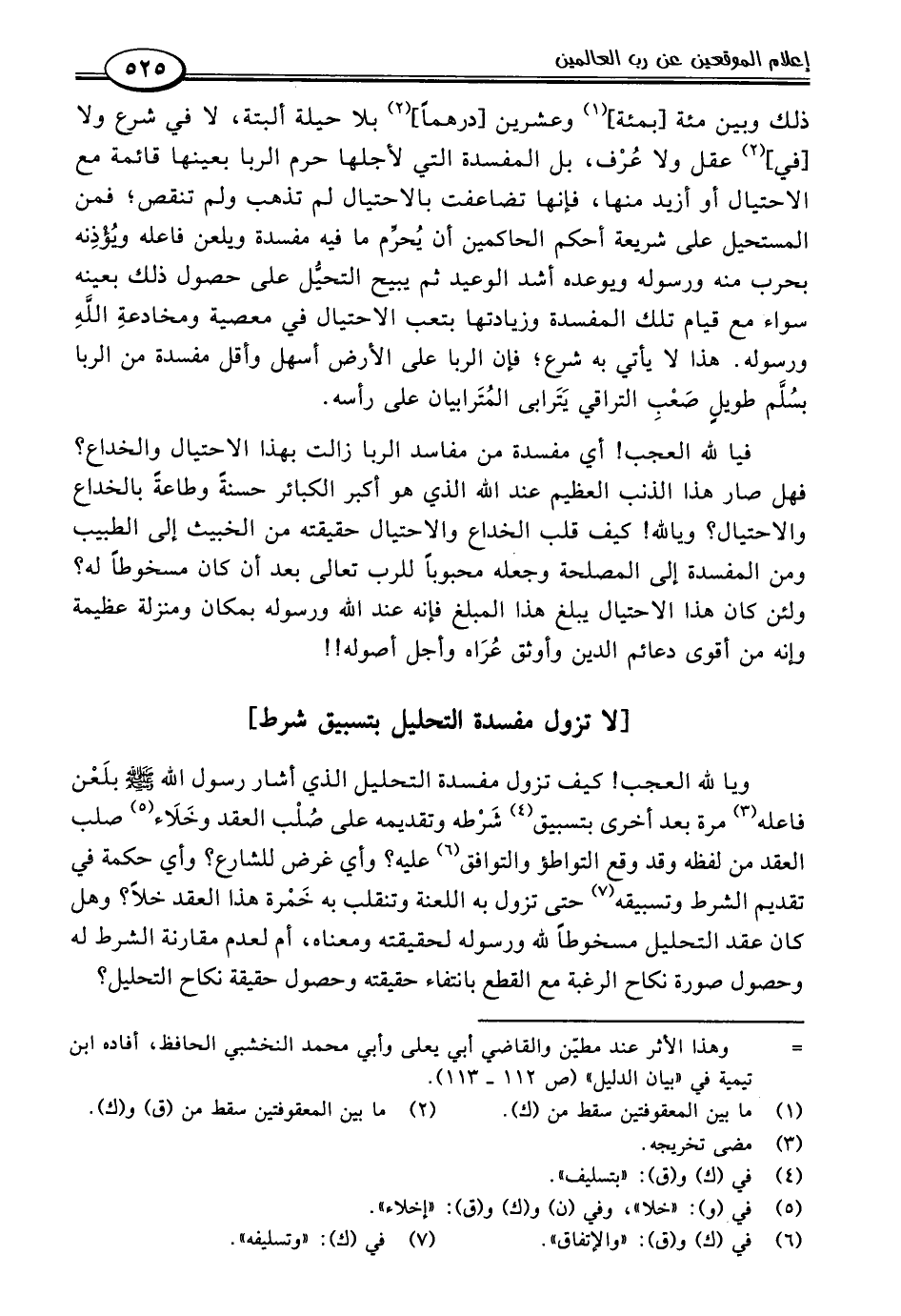 فياللَّه العجب! أي مفسدة من مفاسد الربا زالت بهذا الاحتيال والخداع؟ فهل صار هذا الذنب العظيم عند اللَّه الذي هو أكبر الكبائر حسنةً وطاعةً بالخداع والاحتيال؟ وياللَّه! كيف قلب الخداع والاحتيال حقيقته من الخبيث إلى الطبيب ومن المفسدة إلى المصلحة وجعله محبوبًا للرب تعالى بعد أن كان مسخوطًا له؟ ولئن كان هذا الاحتيال يبلغ هذا المبلغ فإنه عند اللَّه ورسوله بمكان ومنزلة عظيمة وإنه من أقوى دعائم الدين وأوثق عُرَاه وأجل أصوله!!