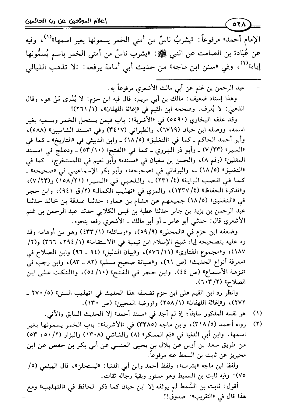(٢) رواه أحمد (٥/ ٣١٨)، وابن ماجه (٣٣٨٥) في "الأشربة": باب الخمر يسمونها بغير اسمها، وابن أبي الدنيا في "ذم المسكر" (٨) والشاشي (١٣٠٨) والبزار (٢/ ٥٠، ٥٣) من طريق سعد بن أوس عن بلال بن يحيى العنسي عن أبي بكر بن حفص عن ابن محيريز عن ثابت بن السمط عنه مرفوعًا.