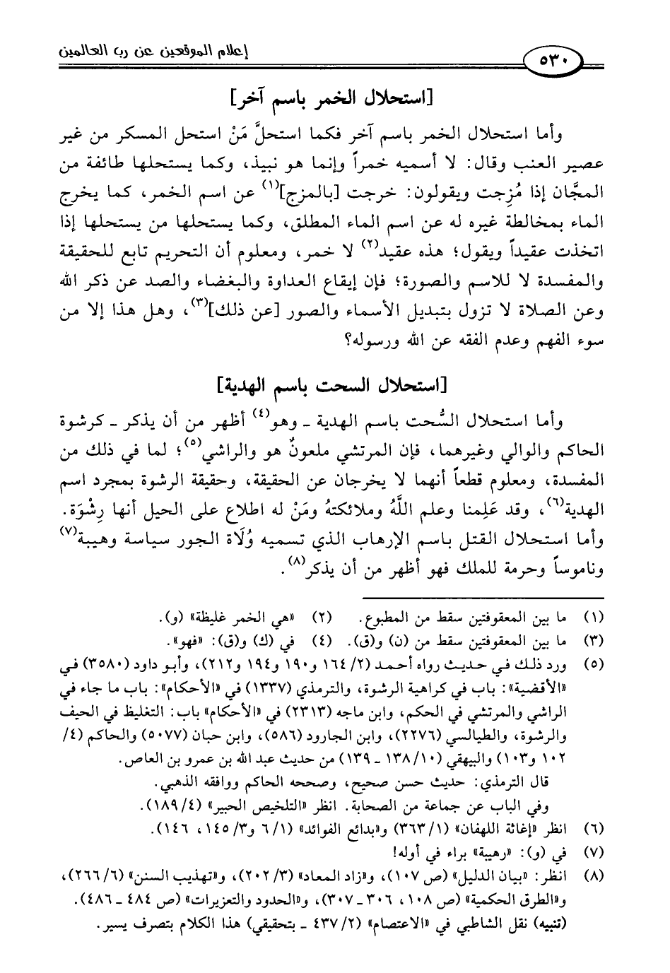 وأما استحلال السُّحت باسم الهدية -وهو (٤) أظهر من أن يذكر- كرشوة الحاكم والوالي وغيرهما، فإن المرتشي ملعونٌ هو والراشي (٥)؛ لما في ذلك من المفسدة، ومعلوم قطعًا أنهما لا يخرجان عن الحقيقة، وحقيقة الرشوة بمجرد اسم الهدية (٦)، وقد عَلِمنا وعلم اللَّهُ وملائكتهُ ومَنْ له اطلاع على الحيل أنها رِشْوَة. وأما استحلال القتل باسم الإرهاب الذي تسميه وُلَاة الجور سياسة وهيبة (٧) وناموسًا وحرمة للملك فهو أظهر من أن يذكر (٨).