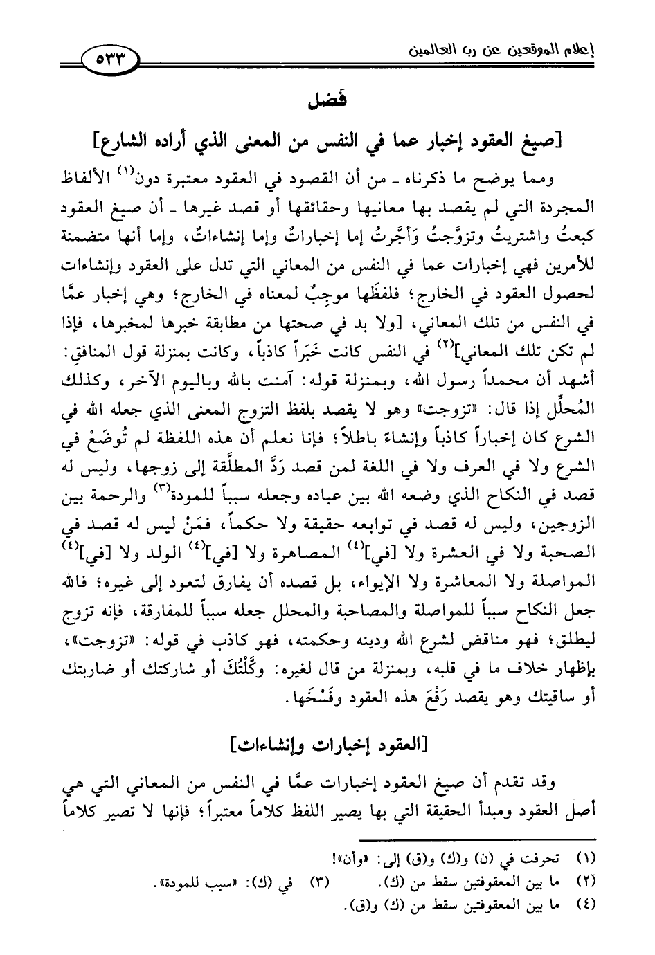 وقد تقدم أن صيغ العقود إخبارات عمَّا في النفس من المعاني التي هي أصل العقود ومبدأ الحقيقة التي بها يصير اللفظ كلامًا معتبرًا؛ فإنها لا تصير كلامًا