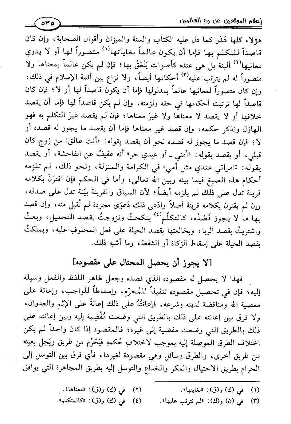 فهذا لا يحصل له مقصوده الذي قصده وجعل ظاهر اللفظ والفعل وسيلة إليه؛ فإن في تحصيل مقصوده تنفيذًا للمُحرّم، وإسقاطًا للواجب، وإعانة على معصية اللَّه ومناقضة لدينه وشرعه، فإعانتُهُ على ذلك إعانةٌ على الإثم والعدوان، ولا فرق بين إعانته على ذلك بالطريق التي وضعت مُفْضِية إليه وبين إعانته على ذلك بالطريق التي وضعت مفضية إلى غيره؛ فالمقصود إذا كان واحدًا لم يكن اختلاف الطرق الموصلة إليه بموجب لاختلافِ حُكمهِ فيَحْرُم من طريق وَيحِل بعينه من طريق أخرى، والطرق وسائل وهي مقصودة لغيرها، فأي فرق بين التوسل إلى الحرام بطريق الاحتيال والمكر والخداع والتوسل إليه بطريق المجاهرة التي يوافق