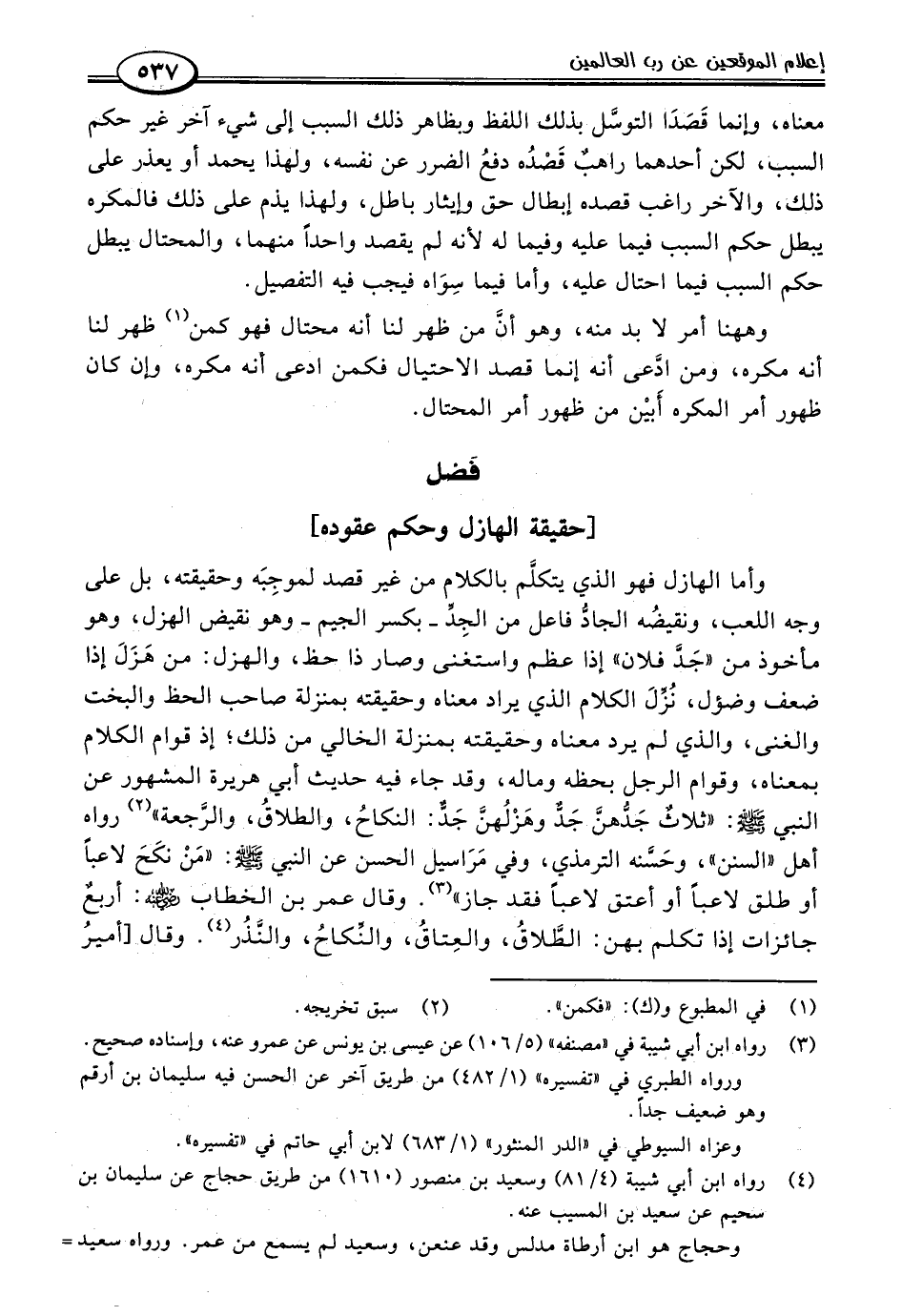 وأما الهازل فهو الذي يتكلم بالكلام من غير قصد لموجِبَه وحقيقته، بل على وجه اللعب، ونقيضُه الجادُّ فاعل من الجِدِّ -بكسر الجيم- وهو نقيض الهزل، وهو مأخوذ من "جَدَّ فلان" إذا عظم واستغنى وصار ذا حظ، والهزل: من هَزَلَ إذا ضعف وضؤل، نُزِّلَ الكلام الذي يراد معناه وحقيقته بمنزلة صاحب الحظ والبخت والغنى، والذي لم يرد معناه وحقيقته بمنزلة الخالي من ذلك؛ إذ قوام الكلام بمعناه، وقوام الرجل بحظه وماله، وقد جاء فيه حديث أبي هريرة المشهور عن النبي -صلى اللَّه عليه وسلم-: "ثلاثٌ جَدُّهنَّ جَدٌّ وهَزْلُهنَّ جَدٌّ: النكاحُ، والطلاقُ، والرَّجعة" (٢) رواه أهل "السنن"، وحَسَّنه الترمذي، وفي مَرَاسيل الحسن عن النبي -صلى اللَّه عليه وسلم-: "مَنْ نكَحَ لاعبًا أو طلق لاعبًا أو أعتق لاعبًا فقد جاز" (٣). وقال عمر بن الخطاب -رضي اللَّه عنه-: أربعٌ جائزات إذا تكلم بهن: الطَّلاقُ، والعِتاقُ، والنِّكاحُ، والنَّذُر (٤). وقال [أميرُ