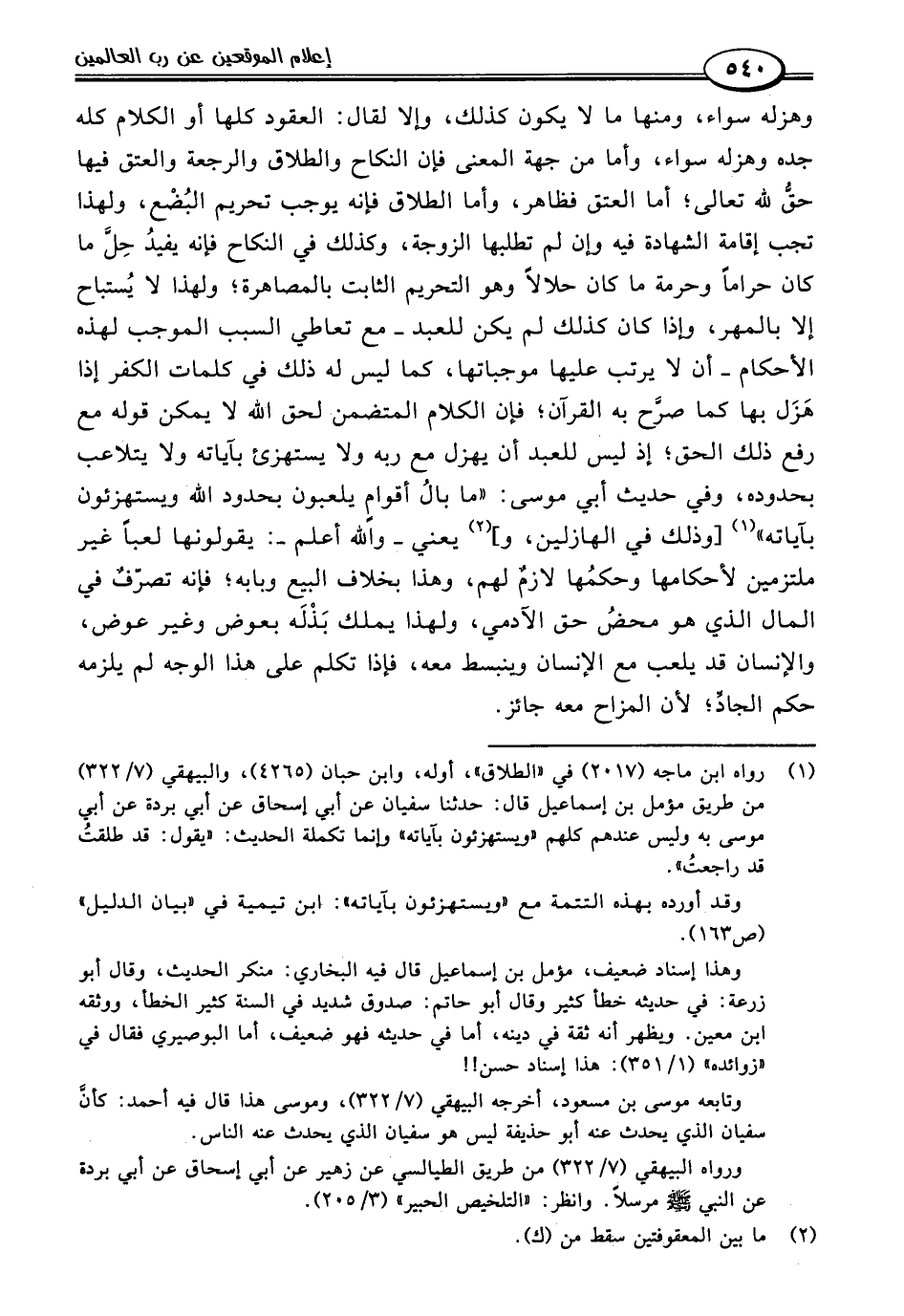(١) رواه ابن ماجه (٢٠١٧) في "الطلاق"، أوله، وابن حبان (٤٢٦٥)، والبيهقي (٧/ ٣٢٢) من طريق مؤمل بن إسماعيل قال: حدثنا سفيان عن أبي إسحاق عن أبي بردة عن أبي موسى به وليس عندهم كلهم "ويستهزئون بآياته" وإنما تكملة الحديث: "يقول: قد طلقتُ قد راجعتُ".