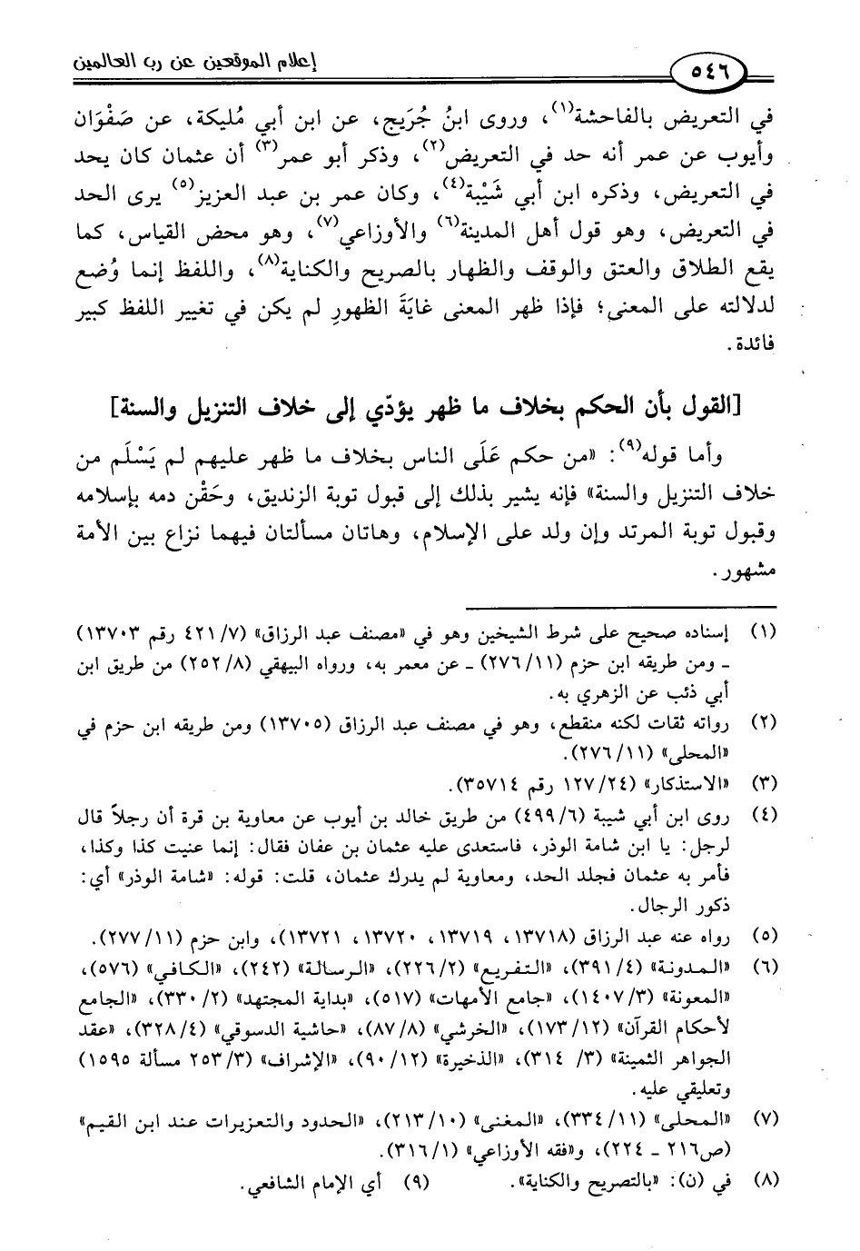 في التعريض بالفاحشة (١)، وروى ابنُ جُرَيج، عن ابن أبي مُليكة، عن صَفْوَان وأيوب عن عمر أنه حد في التعريض (٢)، وذكر أبو عمر (٣) أن عثمان كان يحد في التعريض، وذكره ابن أبي شَيْبة (٤)، وكان عمر بن عبد العزيز (٥) يرى الحد في التعريض، وهو قول أهل المدينة (٦) والأوزاعي (٧)، وهو محض القياس، كما يقع الطلاق والعتق والوقف والظهار بالصريح والكناية (٨)، واللفظ إنما وُضع لدلالته على المعنى؛ فإذا ظهر المعنى غايَةَ الظهورِ لم يكن في تغيير اللفظ كبير فائدة.