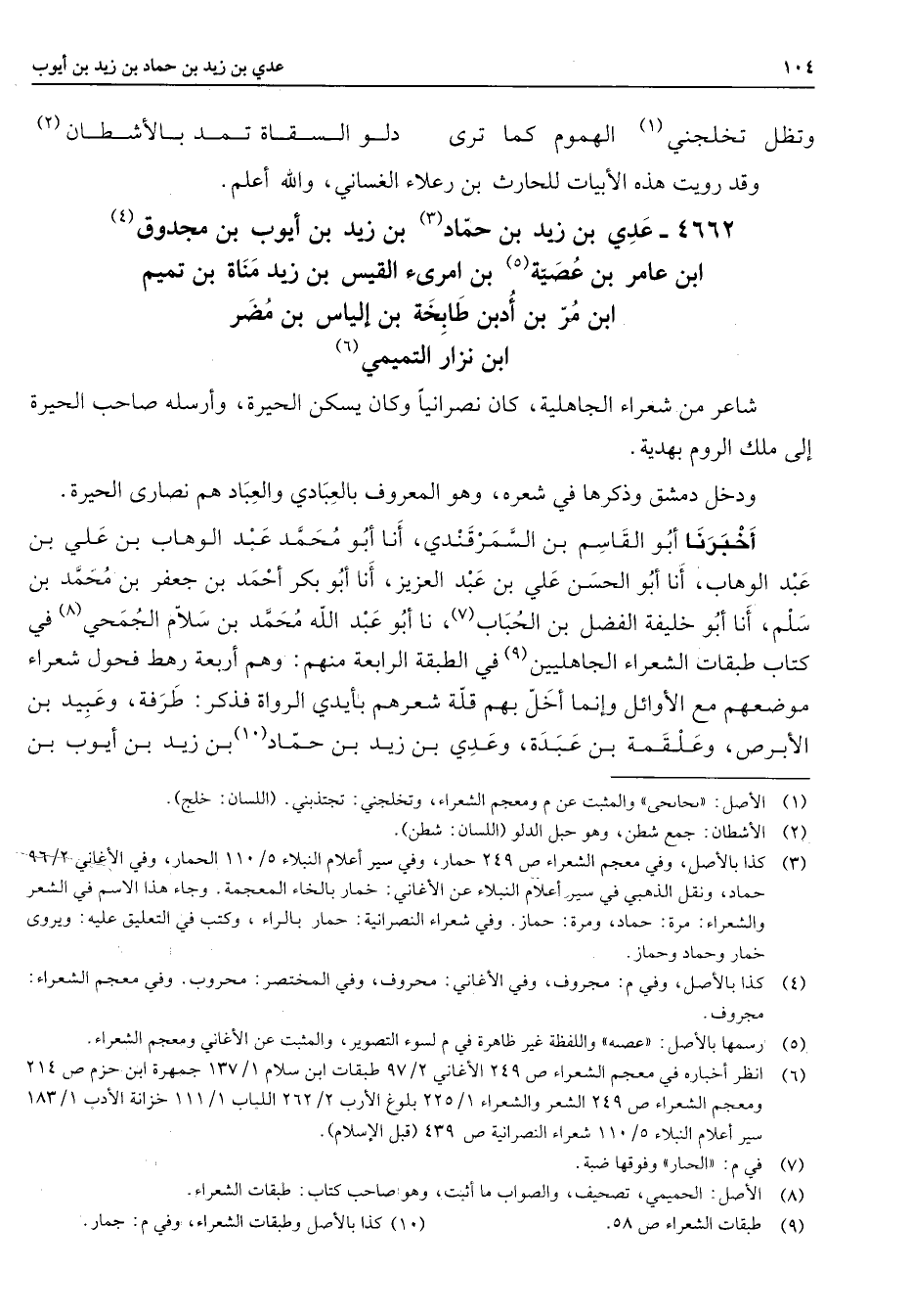 4662 - عدي بن زيد بن حماد (3) بن زيد بن أيوب بن مجدوق (4) بن عامر بن عصية (5) بن امرئ القيس بن زيد مناة بن تميم بن مر بن أدبن طابخة بن إلياس بن مضر بن نزار التميمي (6) شاعر من شعراء الجاهلية كان نصرانيا وكان يسكن الحيرة وأرسله صاحب الحيرة إلى ملك الروم بهدية ودخل دمشق وذكرها في شعره وهو المعروف بالعبادي والعباد هم نصارى الحيرة أخبرنا أبو القاسم بن السمرقندي أنا أبو محمد عبد الوهاب بن علي بن عبد الوهاب أنا أبو الحسن علي بن عبد العزيز أنا أبو بكر أحمد بن جعفر بن محمد بن سلم أنا أبو خليفة الفضل بن الحباب (7) نا أبو عبد الله محمد بن سلام الجمحي (8) في كتاب طبقات الشعراء الجاهليين (9) في الطبقة الرابعة منهم وهم أربعة رهط فحول شعراء موضعهم مع الأوائل وإنما أخل بهم قلة شعرهم بأيدي الرواة فذكر طرفة وعبيد بن الأبرص وعلقمة بن عبدة وعدي بن زيد بن حماد (10) بن زيد بن أيوب بن