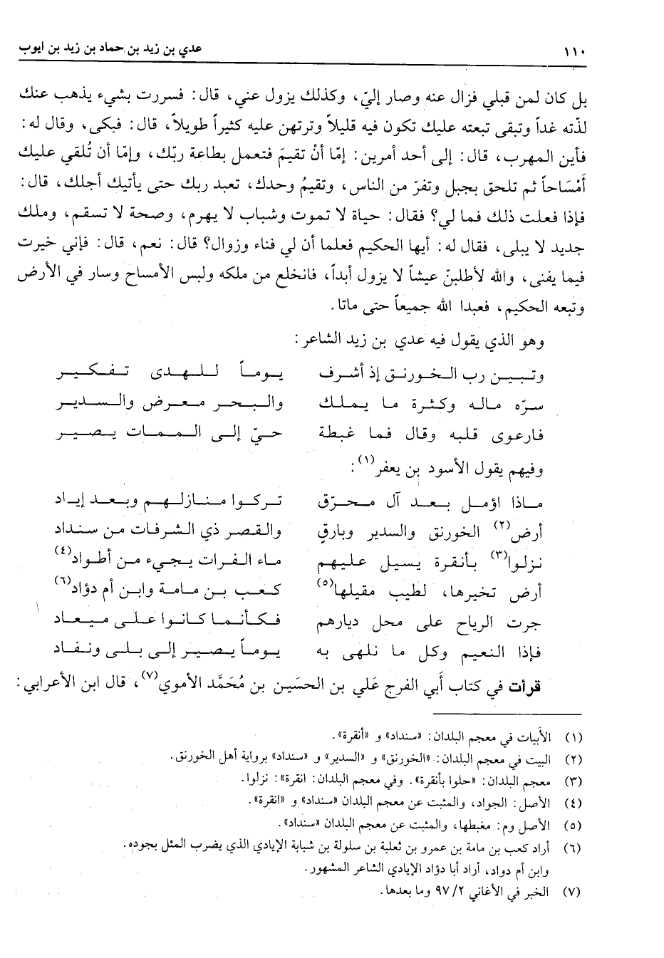 بل كان لمن قبلي فزال عنه وصار إلي وكذلك يزول عني قال فسررت بشئ يذهب عنك لذته غدا وتبقى تبعته عليك تكون فيه قليلا وترتهن عليه كثيرا طويلا قال فبكى وقال له فأين المهرب قال إلى أحد أمرين إما أن تقيم فتعمل بطاعة ربك وإما أن تلقي عليك أمساحا ثم تلحق بجبل وتفر من الناس وتقيم وحدك تعبد ربك حتى يأتيك أجلك قال فإذا فعلت ذلك فما لي فقال حياة لا تموت وشباب لا يهرم وصحة لا تسقم وملك جديد لا يبلى فقال له أيها الحكيم فعلما أن لي فناء وزوال قال نعم قال فإن خيرت فيما يفنى والله لأطلبن عيشا لا يزول أبدا فانخلع من ملكه ولبس الأمساح وسار في الأرض وتبعه الحكيم فعبدا الله جميعا حتى ماتا وهو الذي يقول فيه عدي بن زيد الشاعر * وتبين رب الخورنق إذ أشرف * يوم للهدى تفكير سره ماله وكثرة ما يملك * والبحر معرض والسدير فارعوى قلبه قال فما غبطة * حي إلى الممات يصير * وفيهم يقول الأسود بن يعفر * (1) ماذا اؤمل بعد آل محرق * تركوا منازلهم وبعد إياد أرض (2) الخورنق والسدير وبارق * والقص ذي الشرفات من سنداد نزلوا (3) بأنقرة يسيل عليهم * ماء الفرات يجيئ من أطواد (4) أرض تخيرها لطيب مقيلها * (5) كعب بن مامة وابن أم دؤاد (6) جرت الرياح على محل ديارهم * فكأنما كانوا على ميعاد فإذا النعيم وكل ما نلهى به * يوما يصير إلى بلى ونفاد * قرأت في كتاب أبي الفرج علي بن الحسين بن محمد الأموي (7) قال ابن الأعرابي