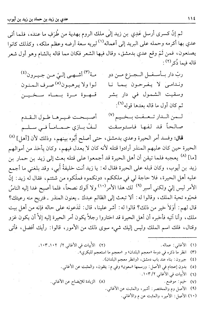 ثم إن كسرى أرسل عدي بن زيد إلى ملك الروم بهدية من طرف ما عنده فلما أتى عدي بها أكرمه وحمله على البريد إلى أعماله (1) ليريه سعة أرضه وعظم ملكه وكذلك كانوا يصنعون فمن ثم وقع عدي بدمشق وقال فيها الشعر فكان مما قاله بالشام وهو أول شعر قاله فيما ذكر * (2) رب دار بأسفل الجزع من دو * مة (3) أشهى إلي من جيرون (4) وندامى لا يفرحون بما نا * لوا ولا يرهبون (5) صرف المنون وسقيت الشمول في دار بشر * قهوة مرة بماء سخين * ثم كان أول ما قاله بعدها قوله * (6) لمن الدار تعفت بخيم * (7) أصبحت غيرها طول القدم صالحا قد لفها فاستوسقت * لف بازي حماما في سلم * قال وفسد أمر الحيرة وعدي بدمشق حتى أصلح أبوه بينهم وذلك لأن أهل (8) الحيرة حين كان عليهم المنذر أرادوا قتله لأنه كان لا يعدل فيهم وكان يأخذ من أموالهم ما (8) يعجبه فلما تيقن أن أهل الحيرة قد أجمعوا على قتله بعث إلى زيد بن حمار بن زيد بن أيوب وكان قبله على الحيرة فقال له يا زيد أنت خليفة أبي وقد بلغني ما أجمع عليه أهل الحيرة فلا حاجة لي في ملككم دونكموه فملكوه من شئتم فقال له زيد إن الأمر ليس إلي ولكني أسبر (9) لك هذا الأمر (10) ولا آلوك نصحا فلما أصبح غدا إليه الناس فحيوه تحية الملك وقالوا له ألا تبعث إلى لظالم عبدك يعنون المنذر فتريح منه رعيتك قال لهم أولا خير من ذلك قالوا له أشر علينا قال تدعونه على حاله فإنه من أهل بيت ملك وأنا آتيه فأخبره أن أهل الحيرة قد اختاروا رجلا يكون أمر الحيرة إليه إلا أن يكون غزو وقتال فلك اسم الملك وليس إليك شئ سوى ذلك من الأمور قالوا رأيك أفضل فأتى