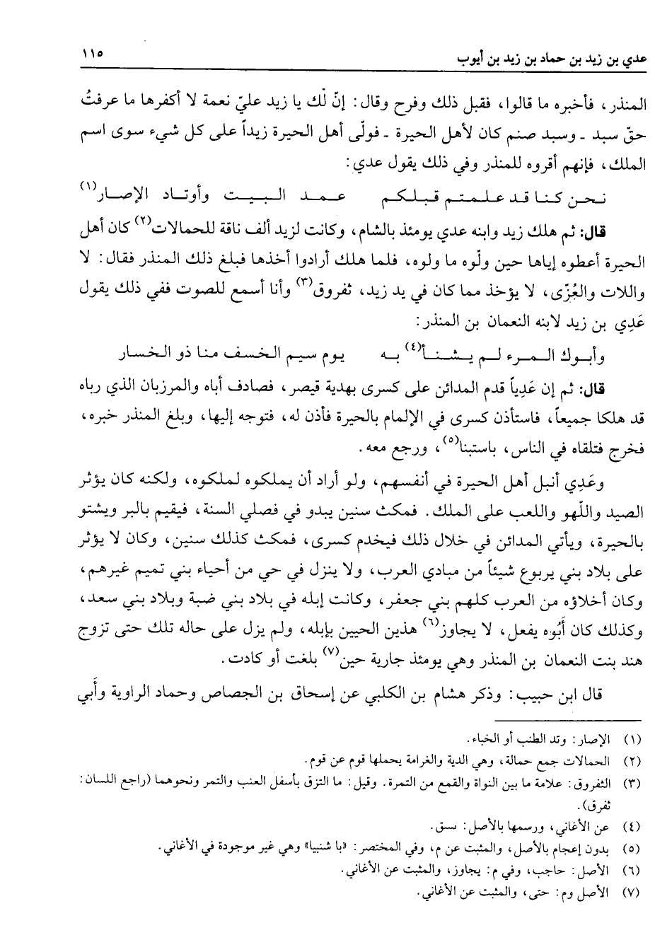 المنذر فأخبره ما قالوا فقبل ذلك وفرح وقال إن لك يا زيد علي نعمة لا أكفرها ما عرفت حق سبد وسبد صنم كان لأهل الحيرة فولى أهل الحيرة زيدا على كل شئ سوى اسم الملك فإنهم أقروه للمنذر وفي ذلك يقول عدي * نحن كنا قد علمتم قبلكم * عمد البيت وأوتاد الإصار * (1) قال ثم هلك زيد وابنه عدي يومئذ بالشام وكانت لزيد ألف ناقة للحمالات (2) كان أهل الحيرة أعطوه إياها حين ولوه ما ولوه فلما هلك أرادوا أخذها فبلغ ذلك المنذر فقال لا واللات والعزى لا يؤخذ مما كان في يد زيد ثفروق (3) وأنا أسمع للصوت ففي ذلك يقول عدي بن زيد لإبنه النعمان بن المنذر * وأبوك المرء لم يشنأ (4) به * يوم سيم الخسف منا ذو الخسار * قال ثم إن عديا قدم المدائن على كسرى بهدية قيصر فصادف أباه والمرزبان الذي رباه قد هلكا جميعا فاستأذن كسرى في الإلمام بالحيرة فأذن له فتوجه إليها وبلغ المنذر خبره فخرج فتلقاه في الناس باستبنا (5) ورجع معه وعدي أنبل أهل الحيرة في أنفسهم ولو أراد أن يملكوه لملكوه ولكنه كان يؤثر الصيد واللهو واللعب على الملك فمكث سنين يبدو في فصلي السنة فيقيم بالبر ويشتو بالحيرة ويأتي المدائن في خلال ذلك فيخدم كسرى فمكث كذلك سنين وكان لا يؤثر على بلاد بني يربوع شيئا من مبادي العرب ولا ينزل في حي من أحياء بني تميم غيرهم وكان أخلاؤه من العرب كلهم بني جعفر وكان إبله في بلاد بني ضبة وبلاد بني سعد وكذلك كان أبوه يفعل ولا يجاوز (6) هذين الحيين بإبله ولم يزل على حاله تلك حتى تزوج هند بنت النعمان بن المنذر وهي يومئذ جارية حين (7) بلغت أو كادت قال ابن حبيب وذكر هشام بن الكبلي عن إسحاق بن الجصاص وحماد الراوية وابي