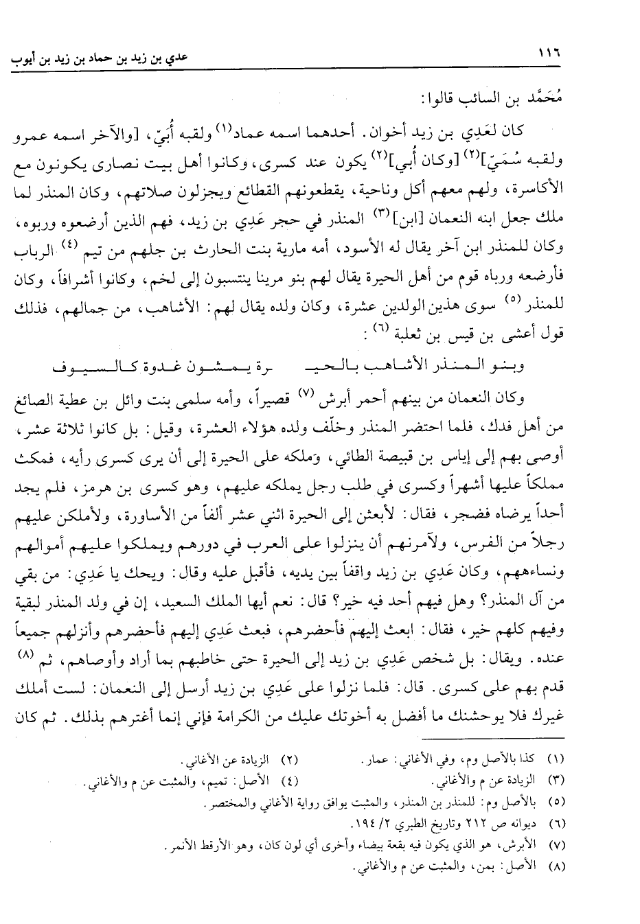 محمد بن السائب قالوا كان لعدي بن زيد أخوان أحدهما اسمه عماد (1) ولقبه أبي والآخر اسمه عمرو ولقبه سمي (2) وكان أبي (2) يكون عند كسرى وكانوا أهل بيت نصارى يكونون مع الأكاسرة ولهم معهم أكل وناحية يقطعونهم القطائع ويجزلون صلاتهم وكان المنذر لما ملك جعل ابنه النعمان ابن (3) المنذر في حجر عدي بن زيد فهم الذين أرضعوه وربوه وكان للمنذر ابن آخر يقال له الأسود أمه مارية بنت الحارث بن جلهم من تيم (4) الرباب فأرضعه ورباه قوم من أهل الحيرة يقال لهم بنوا مرينا ينتسبون إلى لخم وكانوا أشرافا وكان للمنذر (5) سوى هذين الولدين عشرة وكان ولده يقال لهم الأشاهب من جمالهم فذلك قول أعشى بن قيس بن ثعلبة * (6) وبنوا المنذر الأشاهب بالحي * رة يمشون غدوة كالسيوف * وكان النعمان من بينهم أحمر أبرش (7) قصيرا وأمه سلمى بنت وائل بن عطية الصائغ من أهل فدك فلما احتضر المنذر وخلف ولده هؤلاء العشرة وقيل بل كانوا ثلاثة عشر أوصى بهم إلى إياس بن قبيصة الطائي وملكه على الحيرة إلى أن يرى كسرى رأيه فمكث مملكا عليها أشهرا وكسرى في طلب رجل يملكه عليهم وهو كسرى بن هرمز فلم يجد أحدا يرضاه فضجر فقال لأبعثن إلى الحيرة أثني عشرة ألفا من الأساورة ولأملكن علهيم رجلا من الفرس ولأمرنهم أن ينزلوا على العرب في دورهم ويملكوا عليهم أموالهم ونساءهم وكان عدي بن زيد واقفا بين يديه فأقبل عليه وقال ويحك يا عدي من بقي من آل المنذر وهل فيهم أحد فيه خير قال نعم أيها الملك السعيد إن في ولد المنذر لبقية وفيهم كلهم خير فقال ابعث إليهم فأحضرهم فبعث عدي إليهم فأحضرهم وأنزلهم جميعا عنده ويقال بل شخص عدي بن زيد إلى الحيرة حتى خاطبهم بما أراد وأوصاهم ثم (8) قدم بهم على كسرى قال فلما نزلوا على عدي بن زيد أرسل إلى النعمان لست أملك غيرك فلا يوحشنك ما أفضل به أخوتك عليك من الكرامة فإني إنما أغترهم بذلك ثم كان