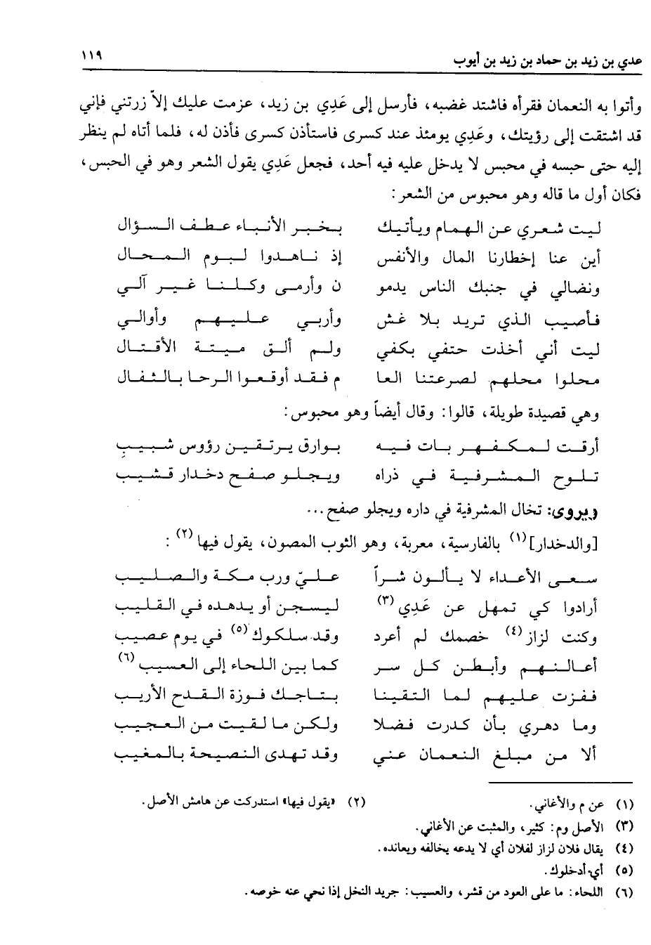 وأتوا به النعمان فقرأه فاشتد غضبه فأرسل إلى عدي بن زيد عزمت عليك إلا زرتني فإني قد اشتقت إلى رؤيتك وعدي يومئذ عند كسرى فاستأذن كسرى فأذن له فلما أتاه لم ينظر إليه حتى حبسه في محبس لا يدخل عليه فيه أحد فجعل عدي يقول الشعر وهو في الحبس فكان أول ما قاله وهو محبوس من الشعر * ليت شعري عن الهمام ويأتيك * بخبر الأنباء عطف السؤال أين عنا إخطارنا المال والأنفس * إذ ناهدوا لبوم المحال ونضالي في جنبك الناس يدمو * ن وأرمى وكلنا غير آلي فأصيب الذي تريد بلا غش * وأربي عليهم وأوالي ليت أني أخذت حتفي بكفي * ولم ألق ميتة الأقتال محلوا محلهم لصرعتنا العا * م فقد أوقعوا الرحا بالثفال * وهي قصيدة طويلة قالوا وقال أيضا وهو محبوس * أرقت لمكفهر بات فيه * بوارق يرتقين رؤوس شبيب تلوح المشرفية في ذراه * ويجلو صفح دخدار قشيب * ويروى تخال المشرفية في داره ويجلو صفح والدخدار (1) بالفارسية معربة وهو الثوب المصون يقول فيها * (2) سعى الأعداء لا يألون شرا * علي ورب مكة والصليب أرادوا كي تمهل عن عدي * (3) ليسجن أو يدهده في القليب وكنت لزاز (4) خصمك لم أعرد * وقد سلكوك (5) في يوم عصيب أعالنهم وأبطن كل سر * كما بين اللحاء إلى العسيب (6) ففزت عليهم لما التقينا * بتاجك فوزة القدح الأريب وما دهري بأن كدرت فضلا * ولكن ما لقيت من العجيب ألا من مبلغ النعمان عني * وقد تهدى النصيحة بالمغيب
