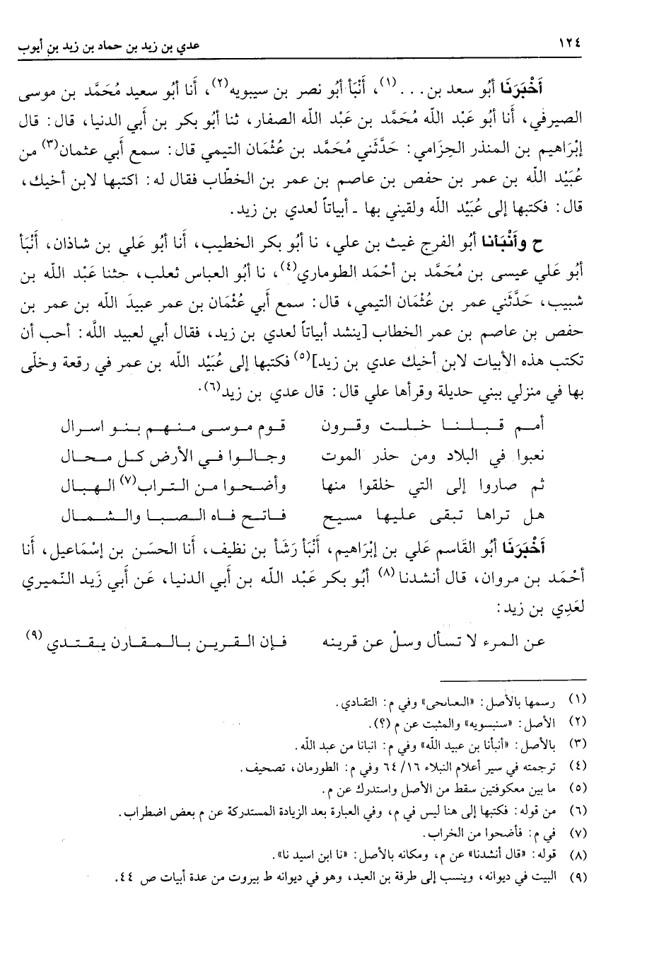 * أخبرنا أبو سعد بن (1) أنبأ أبو نصر بن سيبويه (2) أنا أبو سعيد محمد بن موسى الصيرفي أنا أبو عبد الله محمد بن عبد الله الصفار ثنا أبو بكر بن أبي الدنيا قال قال إبراهيم بن المنذر الحزامي حدثني محمد بن عثمان التيمي قال سمع أبي عثمان (3) من عبيد الله بن عمر بن حفص بن عاصم بن عمر بن الخطاب فقال له اكتبها لإبن أخيك قال فكتبها إلى عبيد الله ولقيني بها أبياتا لعدي بن زيد ح وأنبأنا أبو الفرج غيث بن علي نا أبو بكر الخطيب أنا أبو علي بن شاذان أنبأ أبو علي عيسى بن محمد بن أحمد الطوماري (4) نا أبو العباس ثعلب حثنا عبد الله بن شبيب حدثني عمر بن عثمان التيمي قال سمع أبي عثمان بن عمر عبيد الله بن عمر بن حفص بن عاصم بن عمر الخطاب ينشد أبياتا لعدي بن زيد فقال أبي لعبيد الله أحب أن تكتب هذه الأبيات لإبن أخيك عدي بن زيد (5) فكتبها إلى عبيد الله بن عمر في رقعة وخلى بها في منزلي ببني حديلة وقرأها علي قال قال عدي بن زيد * (6) أمم قبلنا خلت وقرون * قوم موسمنهم بنوا اسرال نعبوا في البلاد ومن حذر الموت * وجالوا في الأرض كل محال ثم صاروا إلى التي خلقوا منها * وأضحوا من التراب (7) الهبال هل تراها تبقى عليها مسيح * فاتح فاه الصبا والشمال * أخبرنا أبو القاسم علي بن إبراهيم أنبأ رشأ بن نظيف أنا الحسن بن إسماعيل أنا أحمد بن مروان قال أنشدنا (8) أبو بكر عبد الله بن أبي الدنيا عن أبي زيد النميري لعدي بن زيد * عن المرء لا تسأل وسل عن قرينة فإن القرين بالمقارن يقتدي (9)