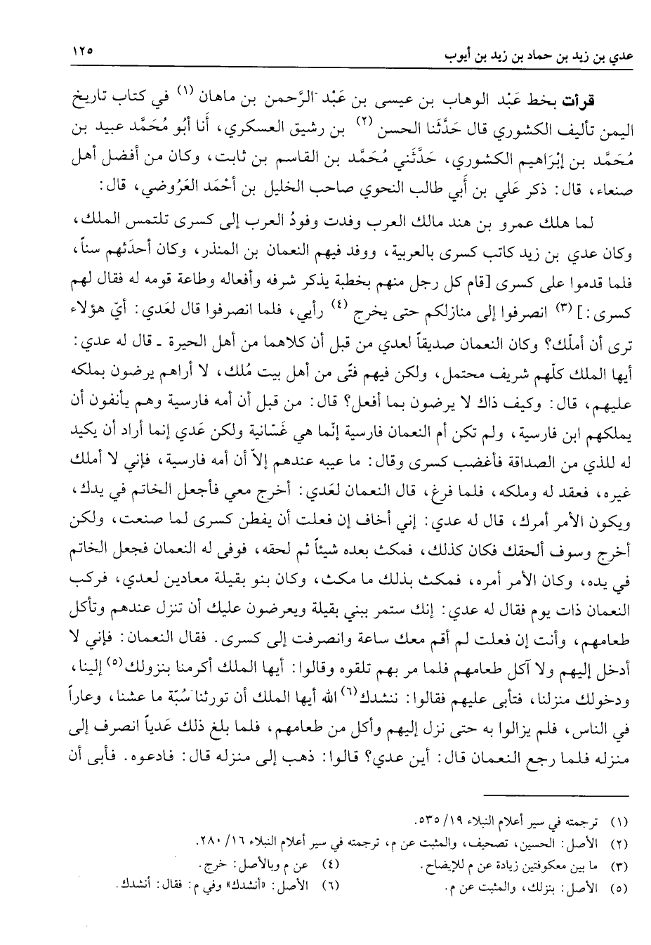 * قرأت بخط عبد الوهاب بن عيسى بن عبد الرحمن بن ماهان (1) في كتاب تاريخ اليمن تأليف الكشوري قال حدثنا الحسن (2) بن رشيق العسكري أنا أبو محمد عبيد بن محمد بن إبراهيم الكشوري حدثني محمد بن القاسم بن ثابت وكان من أفضل أهل صنعاء قال ذكر علي بن أبي طالب النحوي صاحب الخليل بن أحمد العروضي قال لما هلك عمرو بن هند مالك العرب وفدت وفود العرب إلى كسرى تلتمس الملك وكان عدي بن زيد كاتب كسرى بالعربية ووفد فيهم النعمان بن المنذر وكان أحدثهم سنا فلما قدموا على كسرى قام كل رجل منهم بخطبة يذكر شرفه وأفعاله وطاعة قومه له فقال لهم كسرى (3) انصرفوا إلى منازلكم حتى يخرج (4) رأيي فلما انصرفوا قال لعدي أي هؤلاء ترى أن أملك وكان النعمان صديقا لعدي من قبل أن كلاهما من أهل الحيرة قال له عدي أيها الملك كلهم شريف محتمل ولكن فيهم فتى من أهل بيت ملك لا أراهم يرضون بملكه عليهم قال وكيف ذاك لا يرضون بما أفعل قال من قبل أن أمه فارسية وهم يأنفون أن يملكهم ابن فارسية ولم تكن أم النعمان فارسية إنما هي غسانية ولكن عدي إنما أراد أن يكيد له للذي من الصداقة فأغضب كسرى وقال ما عيبه عندهم إلا أن أمه فارسية فإني لا أملك غيره فعقد له وملكه فلما فرغ قال النعمان لعدي أخرج معي فأجعل الخاتم في يدك ويكون الأمر أمرك قال له عدي إني أخاف إن فعلت أن يفظن كسرى لما صنعت ولكن أخرج وسوف ألحقك فكان كذلك فمكث بعده شيئا ثم لحقه فوفى له النعمان فجعل الخاتم في يده وكان الأمر أمره فمكث بذلك ما مكث وكان بنو بقيلة معادين لعدي فركب النعمان ذات يوم فقال له عدي إنك ستمر ببني بقيلة ويعرضون عليك أن تنزل عندهم وتأكل طعامهم وأنت إن فعلت لم أقم معك ساعة وانصرفت إلى كسرى فقال النعمان فإني لا أدخل إليهم ولا آكل طعامهم فلما مر بهم تلقوه وقالوا أيها الملك أكرمنا بنزولك (5) إلينا ودخولك منزلنا فتأبى عليهم فقالوا ننشدك (6) الله أيها الملك أن تورثنا سبة ما عشنا وعارا في الناس فلم يزالوا به حتى نزل إليهم وأكل من طعامهم فلما بلغ ذلك عديا انصرف إلى منزله فلما رجع النعمان قال أين عدي قالوا ذهب إلى منزله قال فادعوه فأبى أن