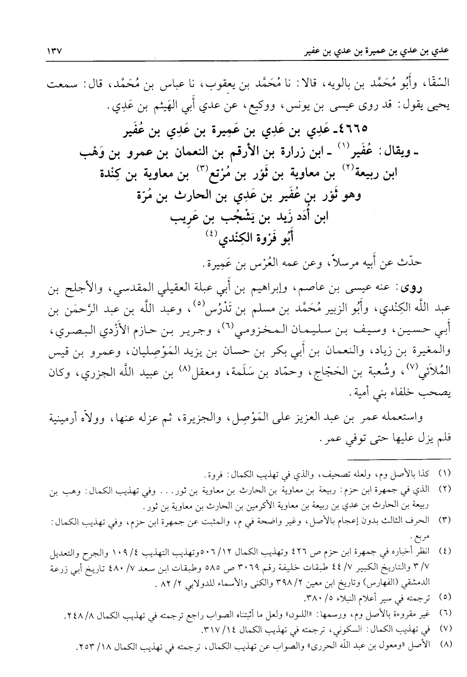 4665 - عدي بن عدي بن عميرة بن عدي بن عفير ويقال عفير (1) ابن زرارة بن الأرقم بن النعمان بن عمرو بن وهب ابن ربيعة (2) بن معاوية بن ثور بن مرتع (3) بن معاوية بن كندة وهو ثور بن عفير بن عدي بن الحارث بن مرة بن أدد زيد بن يشجب بن عريب أبو فروة الكندي (4) حدث عن أبيه مرسلا وعن عمه العرس بن عميرة روى عنه عيسى بن عاصم وإبراهيم بن أبي عبلة العقيلي المقدسي والأجلح بن عبد الله الكندي وأبو الزبير محمد بن مسلم بن تدرس (5) وعبد الله بن عبد الرحمن بن أبي حسين وسيف بن سليمان المخزومي (6) وجرير بن حازم الأزدي البصري والمغيرة بن زياد والنعمان بن أبي بكر بن حسان بن يزيد الموصليان وعمرو بن قيس الملائي (7) وشعبة بن الحجاج وحماد بن سلمة ومعقل (8) بن عبيد الله الجزري وكان يصحب خلفاء بني أمية واستعمله عمر بن عبد العزيز على الموصل والجزيرة ثم عزله عنها وولاه أرمينية فلم يزل عليها حتى توفي عمر