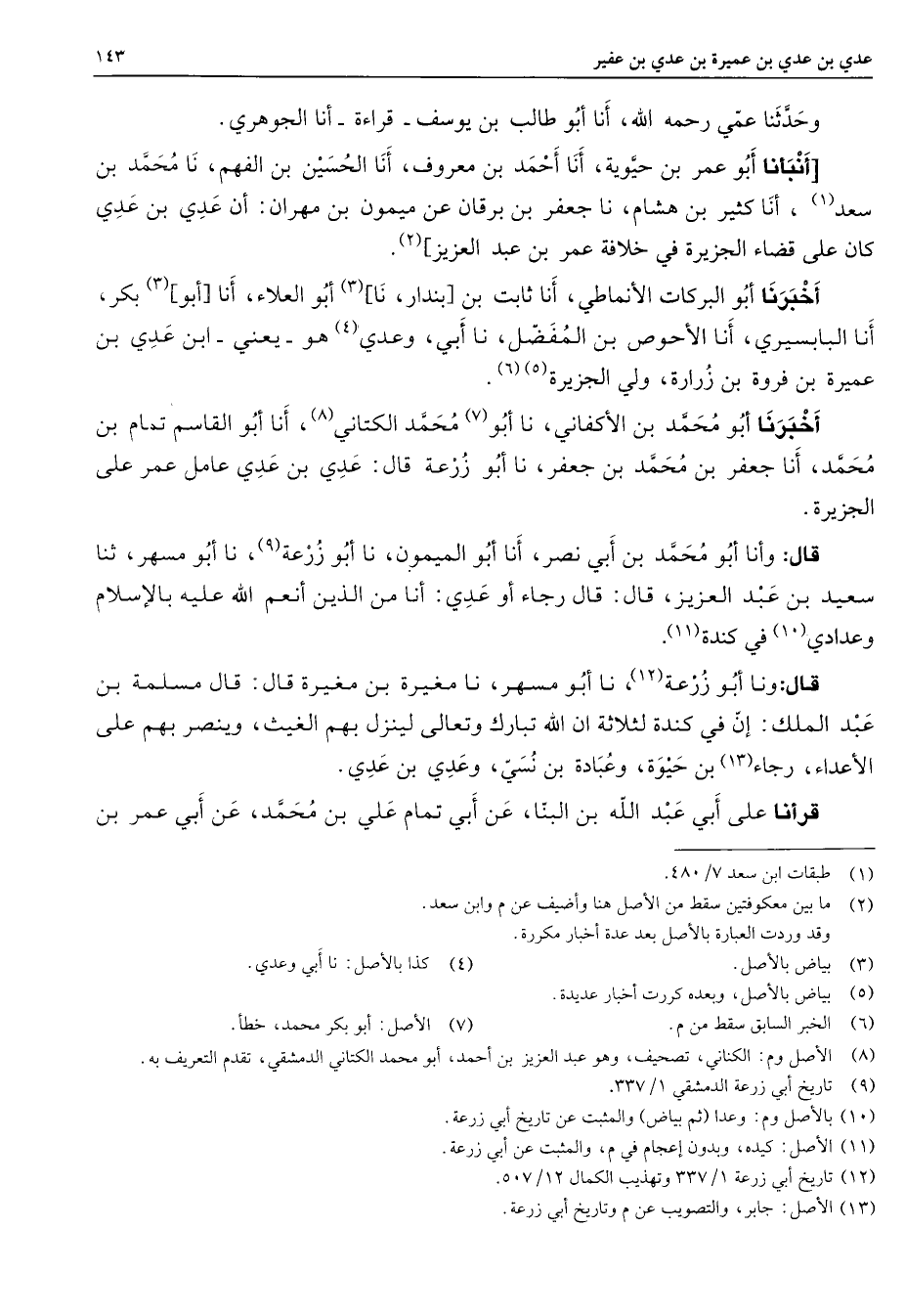 وحدثنا عمي رحمه الله أنا أبو طالب بن يوسف قراءة أنا الجوهري أنبأنا أبو عمر بن حيوية أنا أحمد بن معروف أنا الحسين بن الفهم نا محمد بن سعد (1) أنا كثير بن هشام أنا جعفر بن برقان عن ميمون بن مهران أن عدي بن عدي كان على قضاء الجزيرة في خلافة عمر بن عبد العزيز (2) أخبرنا أبو البركات الأنماطي أنا ثابت بن بندار نا (3) أبو العلاء أنا أبو (3) بكر أنا البابسيري أنا الأحوص بن المفضل نا أبي وعدي (4) هو يعني ابن عدي بن عميرة بن فروة بن زرارة ولي الجزيرة (5) (6) أخبرنا أبو محمد بن الأكفاني نا أبو (7) محمد الكتاني (8) أنا أبو القاسم تمام بن محمد أنا جعفر بن محمد بن جعفر نا أبو زرعة قال عدي بن عدي عامل عمر على الجزيرة قال وأنا أبو محمد بن أبي نصر أنا أبو الميمون نا أبو زرعة (9) نا أبو مسهر ثنا سعيد بن عبد العزيز قال قال رجاء أو عدي أنا من الذين أنعم الله عليه بالإسلام وعدادي (10) في كندة (11) قال ونا أبو زرعة (12) نا أبو مسهر نا مغيرة بن مغيرة قال قال مسلمة بن عبد الملك إن في كندة لثلاثة أن الله تبارك وتعالى لينزل بهم الغيث وينصر بهم على الأعداء رجاء (13) بن حيوة وعبادة بن نسي وعدي بن عدي قرأنا على أبي عبد الله بن البنا عن أبي تمام علي بن محمد عن أبي عمر بن