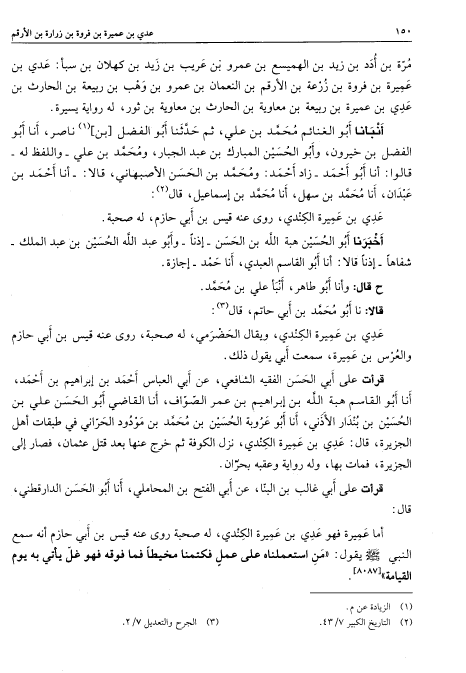 مرة بن أدد بن زيد بن الهميسع بن عمرو بن عريب بن زيد بن كهلان بن سبأ عدي بن عميرة بن فروة بن زرعة بن الأرقم بن النعمان بن عمرو بن وهب بن ربيعة بن الحارث بن عدي بن عميرة بن ربيعة بن معاوية بن الحارث بن معاوية بن ثور له رواية يسيرة أنبأنا أبو الغنائم محمد بن علي ثم حدثنا أبو الفضل بن (1) ناصر أنا أبو الفضل بن خيرون وأبو الحسين المبارك بن عبد الجبار ومحمد بن علي واللفظ له قالوا أنا أبو أحمد زاد أحمد ومحمد بن الحسن الأصبهاني قالا أنا أحمد بن عبدان أنا محمد بن سهل أنا محمد بن إسماعيل قال (2) عدي بن عميرة الكندي روى عنه قيس بن أبي حازم له صحبة أخبرنا أبو الحسين هبة الله بن الحسن إذنا وأبو عبد الله الحسين بن عبد الملك شفاها إذنا قالا أنا أبو القاسم العبدي أنا حمد إجازة ح قال وأنا أبو طاهر أنبأ علي بن محمد قالا نا أبو محمد بن أبي حاتم (3) قال عدي بن عميرة الكندي ويقال الحضرمي له صحبة روى عنه قيس بن أي حازم والعرس بن عميرة سمعت أبي يقول ذلك قرأت على أبي الحسن الفقيه الشافعي عن أبي العباس أحمد بن إبراهيم بن أحمد أنا أبو القاسم هبة الله بن إبراهيم بن عمر الصواف أنا القاضي أبو الحسن علي بن الحسين بن بندار الأذني أنا أبو عروبة الحسين بن محمد بن مودود الحراني في طبقات أهل الجزيرة قال عدي بن عميرة الكندي نزل الكوفة ثم خرج عنها بعد قتل عثمان فصار إلى الجزيرة فمات بها وله رواية وعقبه بحران قرأت على أبي غالب بن البنا عن أبي الفتح بن المحاملي أنا أبو الحسن الدارقطني قال أما عميرة فهو عدي بن عميرة الكندي له صحبة روى عنه قيس بن أبي حازم أنه سمع النبي (صلى الله عليه وسلم) يقول من استعملناه على عمل فكتمنا مخيطا فما فوقه فهو غل يأتي به يوم القيامة