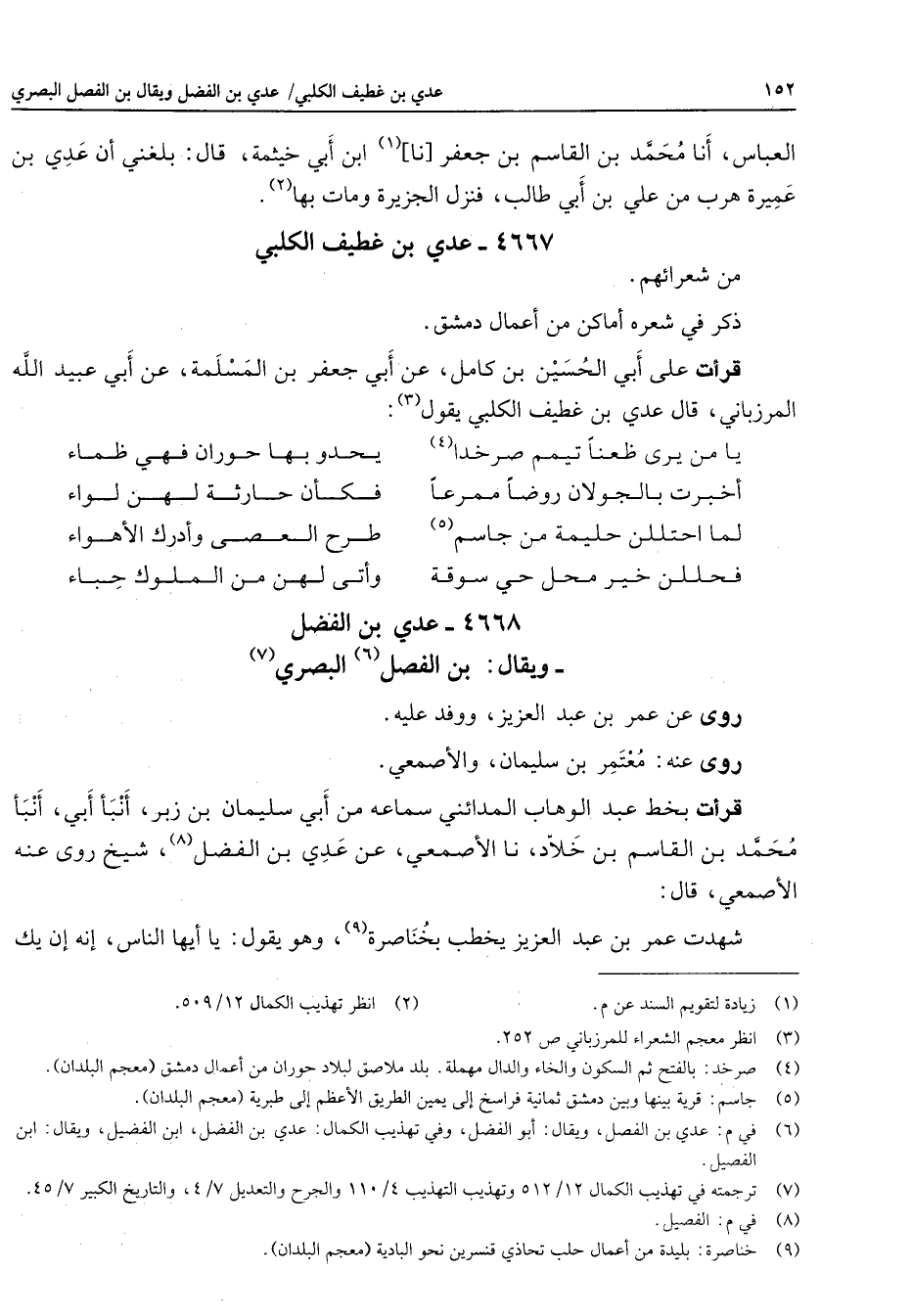 4668 - عدي بن الفضل ويقال بن الفصل (6) البصري (7) روى عن عمر بن عبد العزيز ووفد عليه روى عنه معتمر بن سليمان والأصمعي قرأت بخط عبد الوهاب المدائني سماعه من أبي سليمان بن زبر أنبأ أبي أنبأ محمد بن القاسم بن خلاد نا الأصمعي عن عدي بن الفضل (8) شيخ روى عنه الأصمعي قال شهدت عمر ب عبد العزيز يخطب بخناصرة (9) وهو يقول يا أيها الناس إنه إن يك