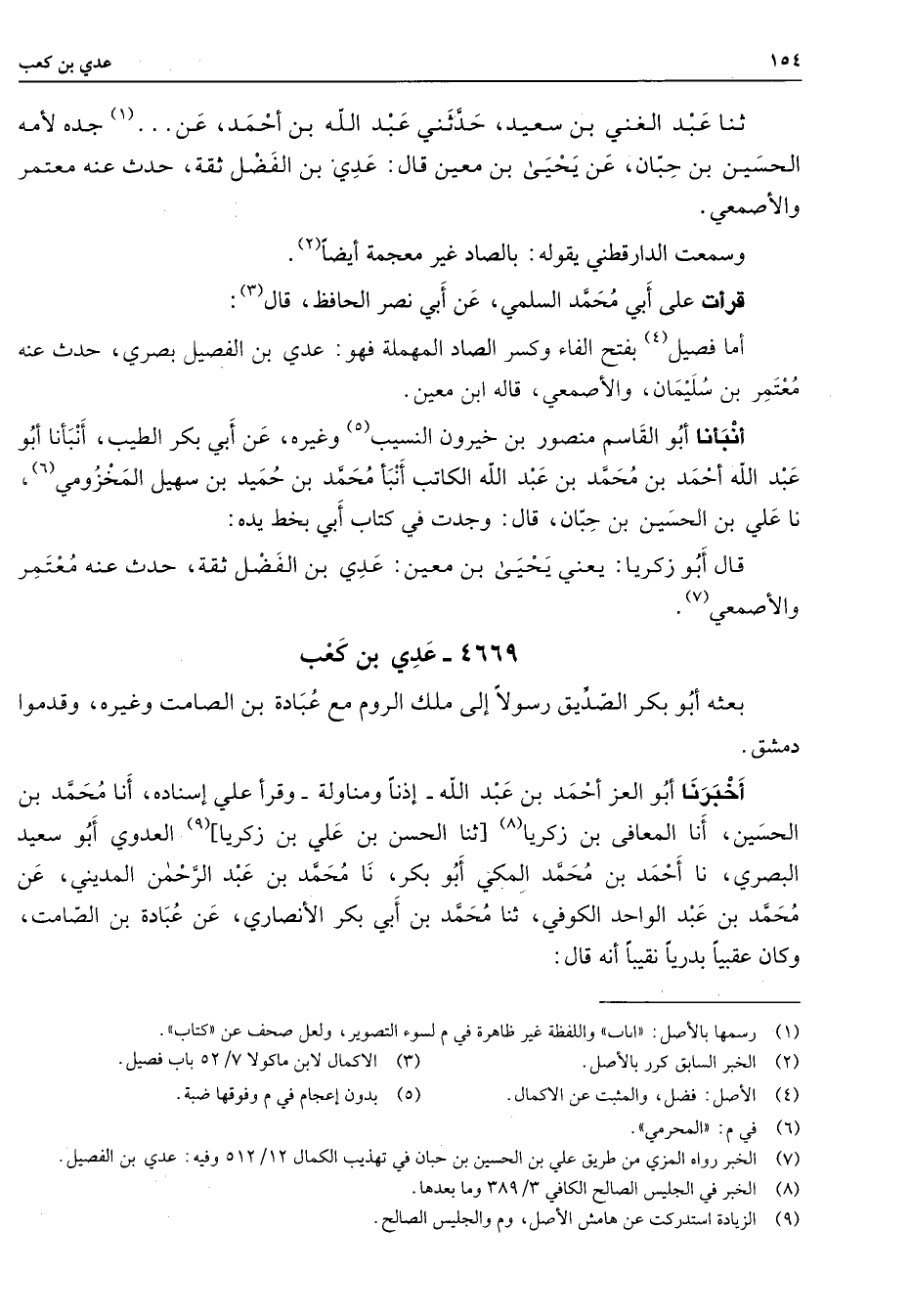 4669 - عدي بن كعب بعثه أبو بكر الصديق رسولا إلى ملك الروم مع عبادة بن الصامت وغيره وقدموا دمشق أخبرنا أبو العز أحمد بن عبد الله إذنا ومناولة وقرأ علي إسناده أنا محمد بن الحسين أنا المعافى بن زكريا (8) ثنا الحسن بن علي بن زكريا (9) العدوي أبو سعيد البصري نا أحمد بن محمد المكي أبو بكر نا محمد بن عبد الرحمن المديني عن محمد بن عبد الواحد الكوفي ثنا محمد بن أبي بكر الأنصاري عن عبادة بن الصامت وكان عقبيا بدريا نقيبا أنه قال